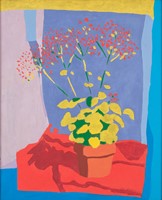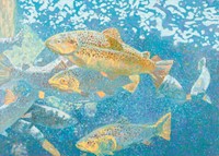 Texas artist Jim Stoker began developing his confetti-splatter technique of painting in 2000 to convey nature in a non-photographic way. A self-described colorist, he paints vivid landscapes over a patterned ground of controlled chaos made by splattering ten pigments over a primed canvas littered with confetti. Stoker has used the technique to paint the canopy of the goldenball leadtree, ocotillo plumes, brilliant fall foliage of the sumac, honeycomb limestone rocks, and most recently the granite spiderwort. “Nature has been my teacher,” says Stoker, who has worked for the U.S. Forest Service and has backpacked, camped, and canoed in many wilderness areas. He and his wife Eloise, also an artist, spend time at their cabin on the Guadalupe River and have been active environmentalists.