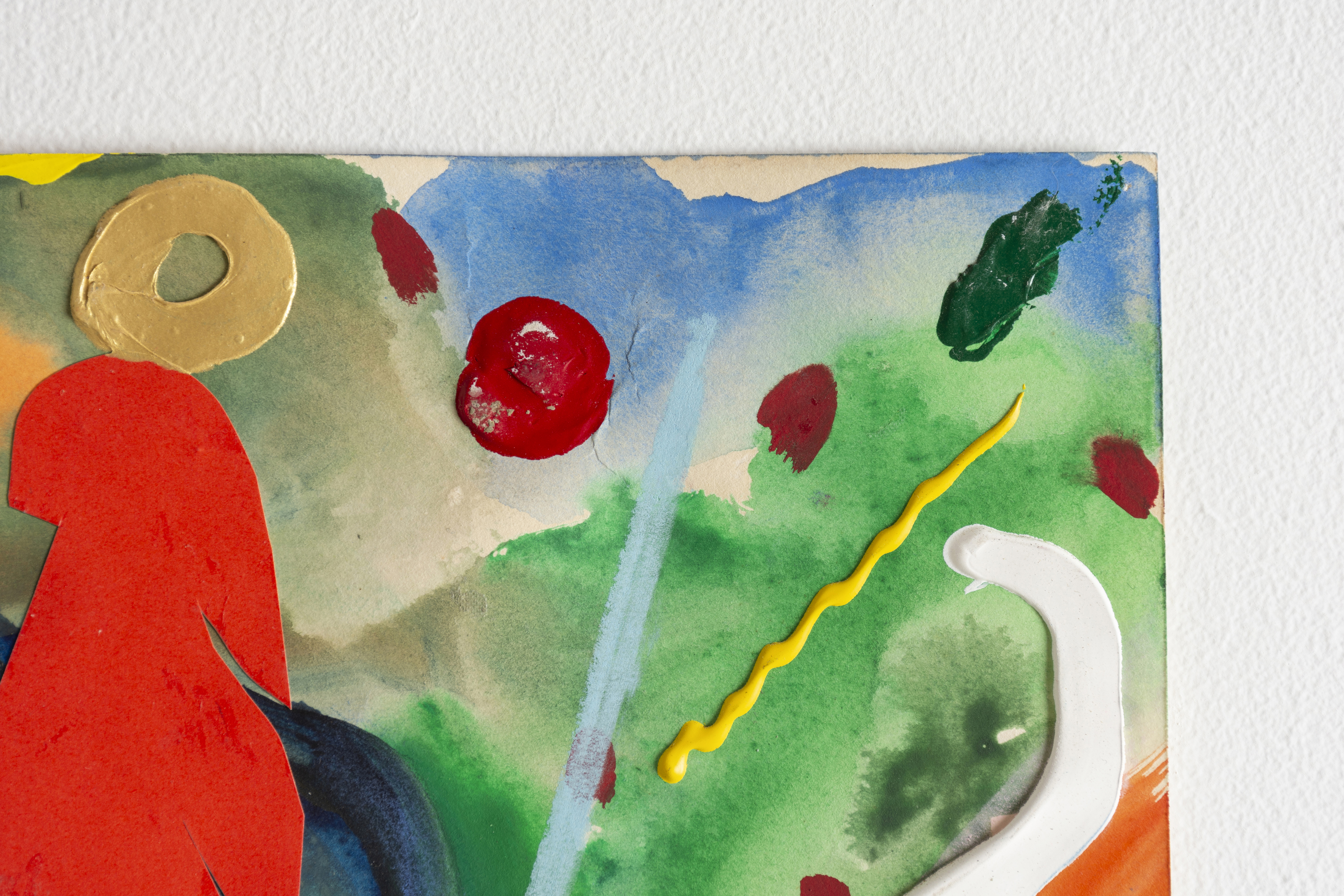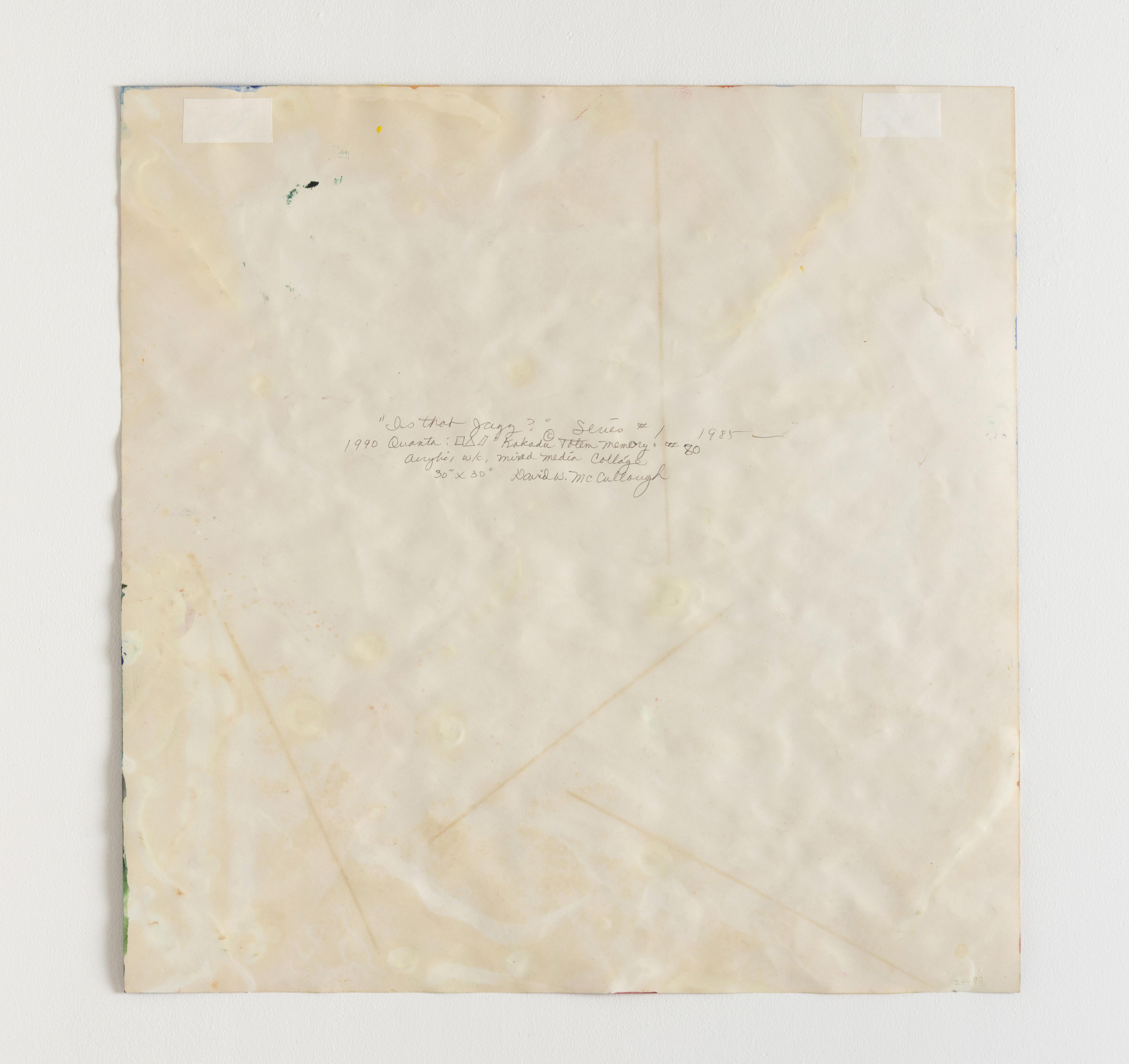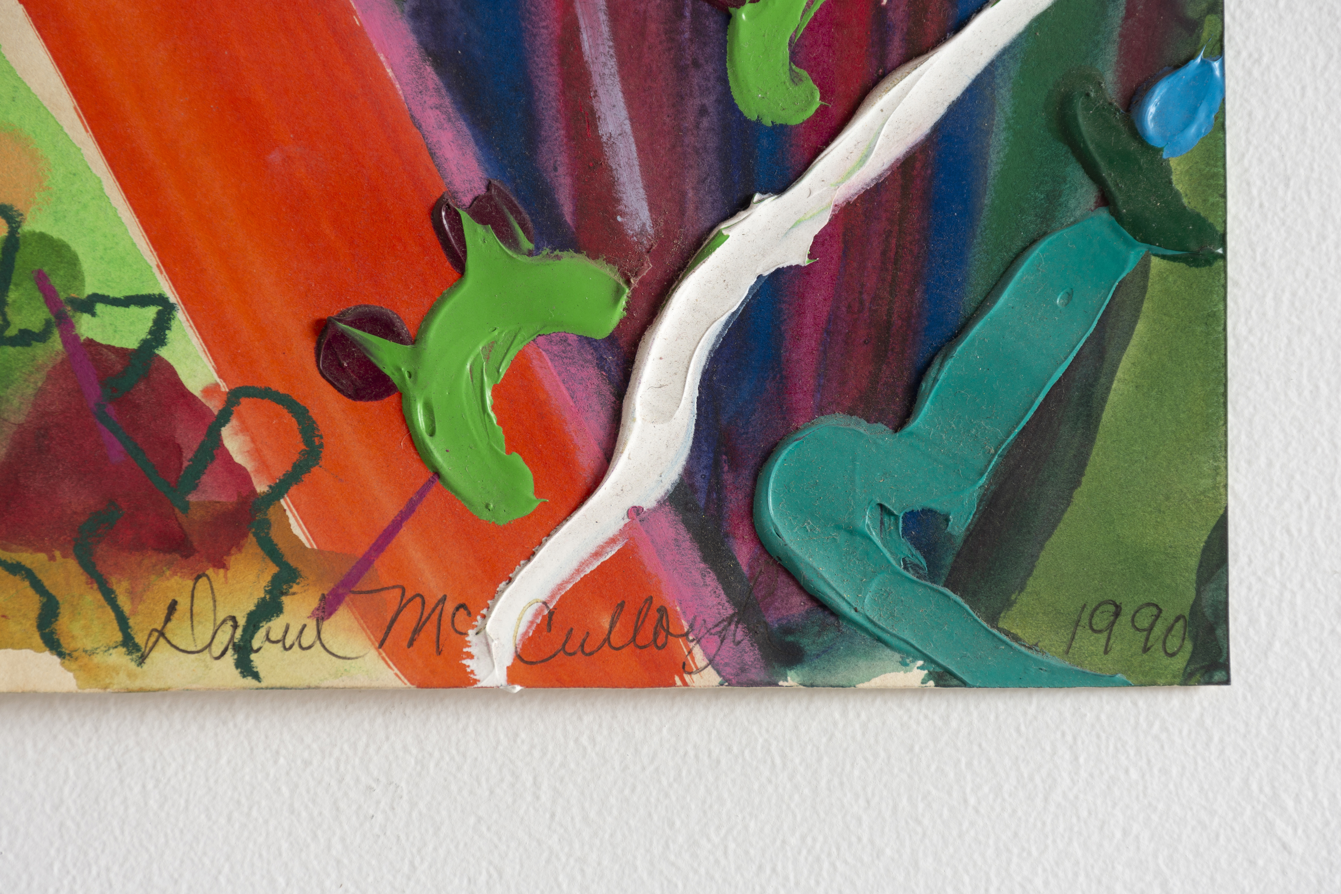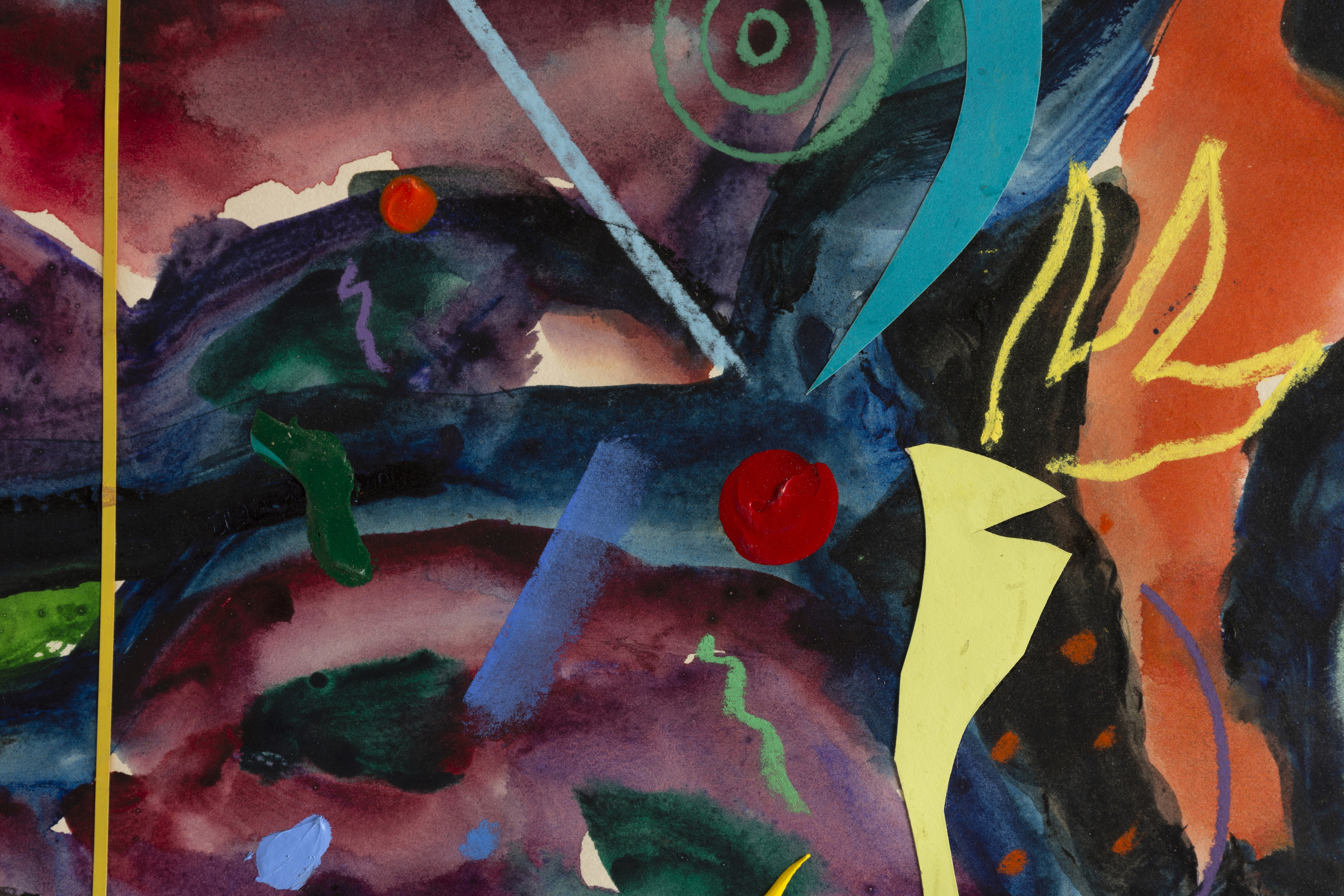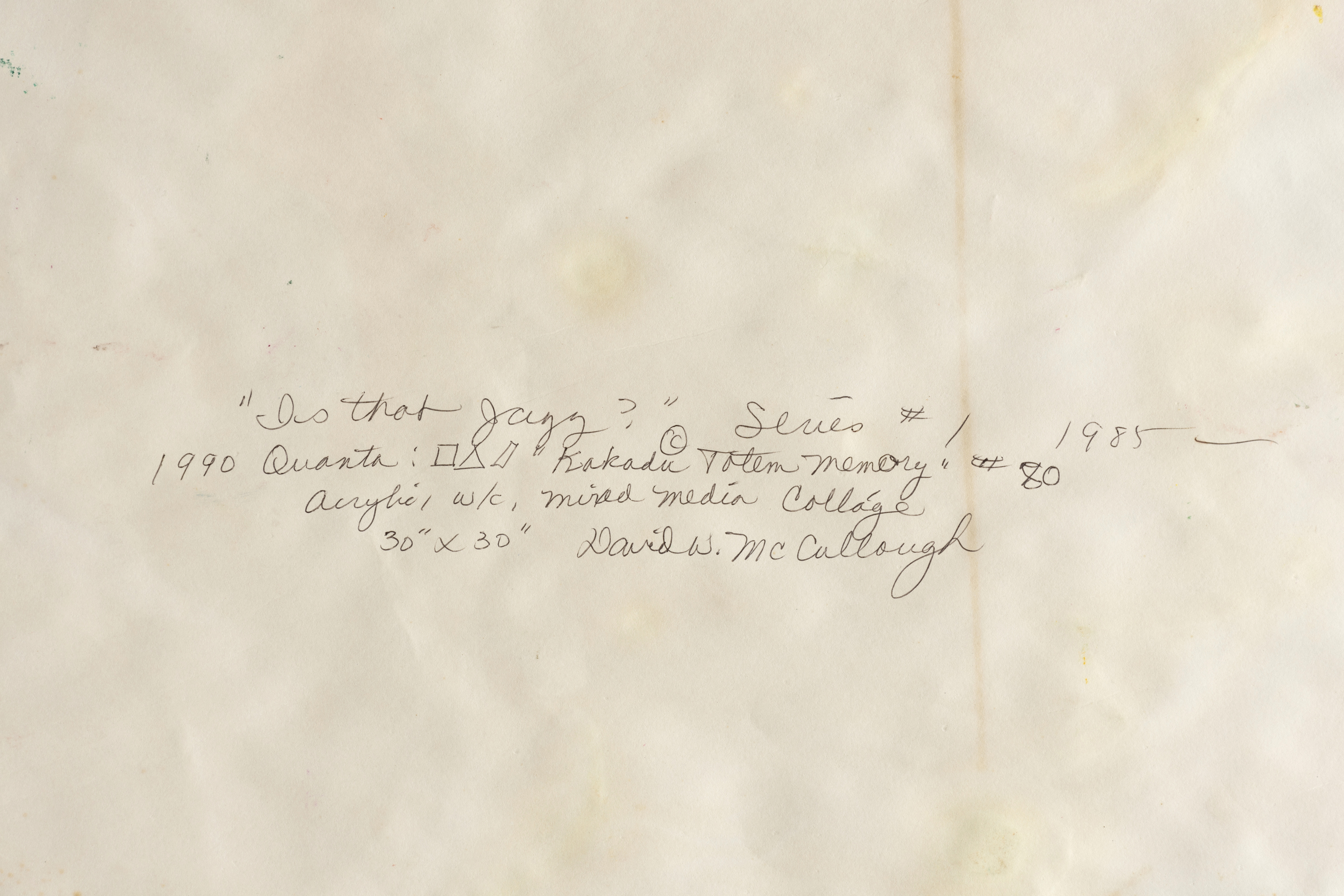 A down under oil pastel spirit figure vibrates this fact on the lower left. Remember that the music tape collages helped me to vibrate throughout this composition with feelings from my own memory bank. Musicians like Gato Barbieri, Carlos Santana, Thelonious Monk, Al Green and others kept me energized each day at the park sites and a year later helped me to translate those experiences into each studio "collageing" process. The curvilinear energy in the drawings reflects my Jazz favorite instrument, the saxophone. The music tapes were beneficial in keeping me visually focused during several all day sessions on the many color/sound exchanges with the outback environment that occurred between my brush and palette, which was much like a drummer rhythmically translating the flow of quantum coherent energies from palette to paper via the magic of 'water'.