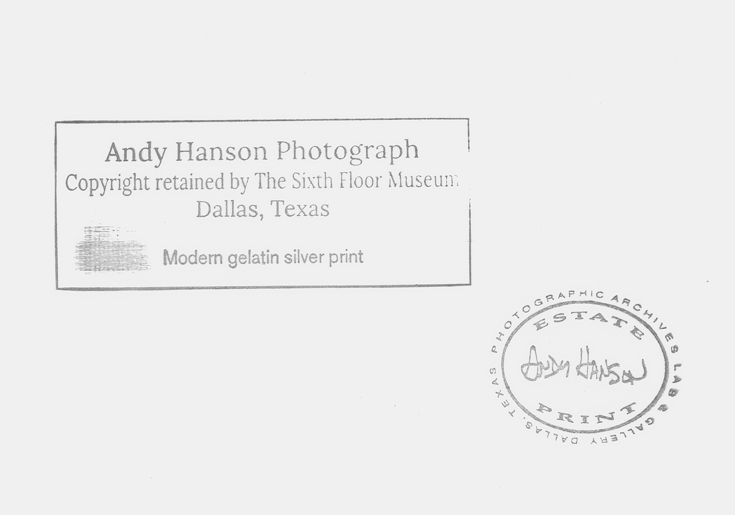 This modern print was printed by Andy Reisberg from the original negative by Andy Hanson. It was authorized and approved by Andy Hanson for gallery exhibition and sales during his lifetime. Upon his death, his estate allowed the remaining collection of prints to be sold by Photographic Archives Gallery. The original negative is now in the collections of Sixth Floor Museum at Dealey Plaza, Dallas, Texas and the Museum holds the copyright.
