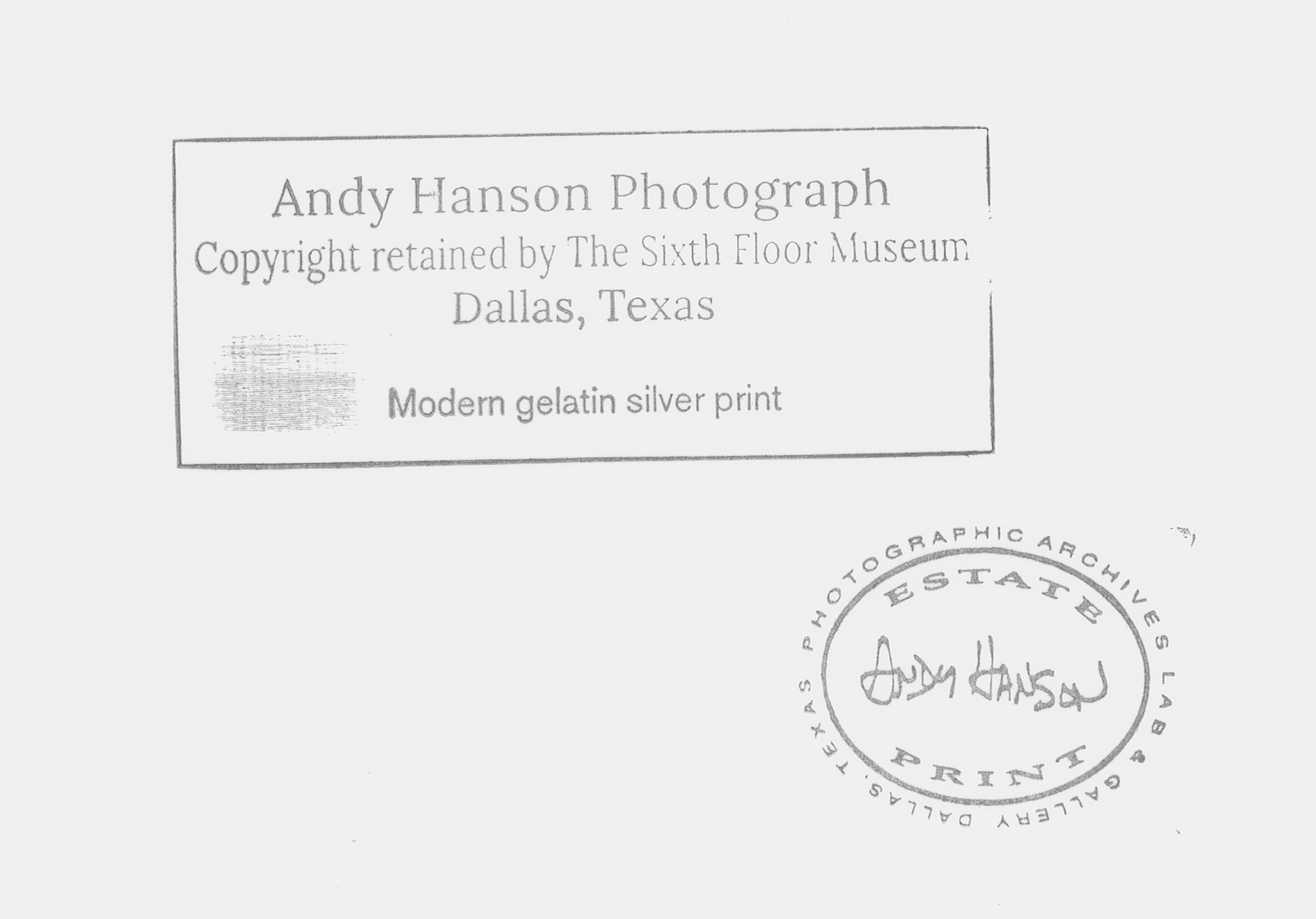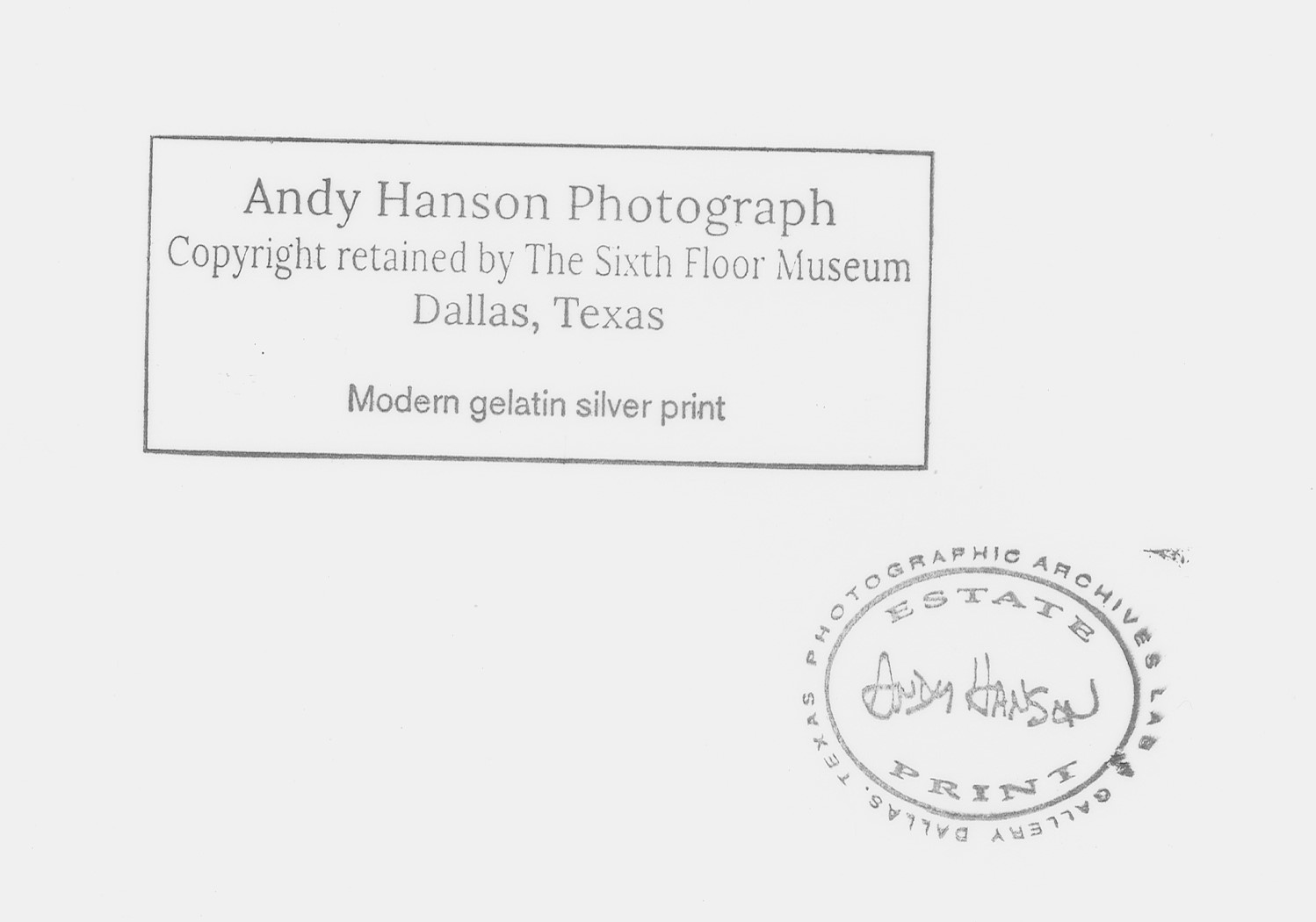 This modern print was produced for gallery inventory during Andy Hanson's lifetime, and with his approval of print quality. Upon his death, his estate allowed the remaining inventory of prints to be sold by Photographic Archives Gallery. The original negative is now in the collections of The Sixth Floor Museum at Dealey Plaza, Dallas, Texas and the Museum holds the copyright.