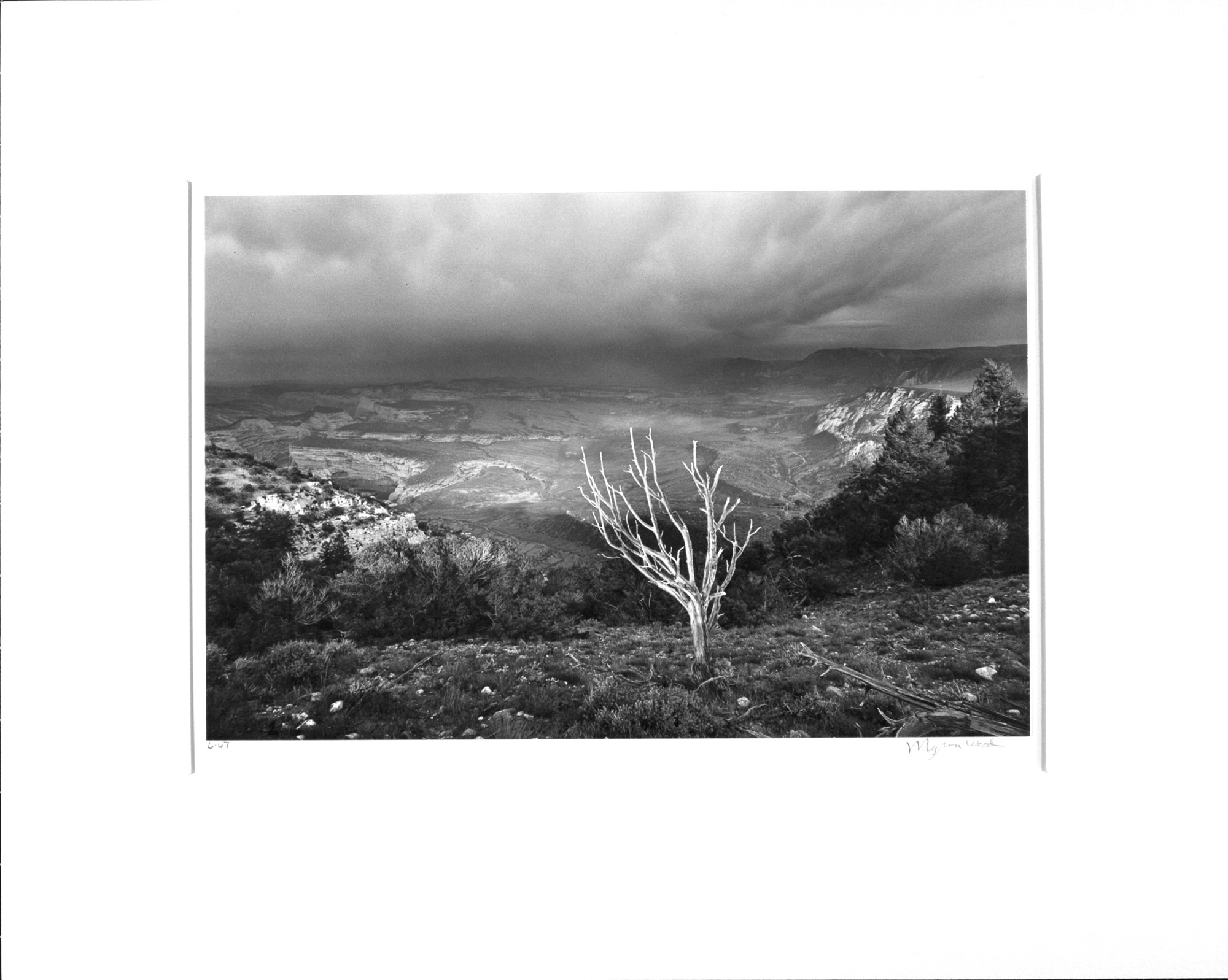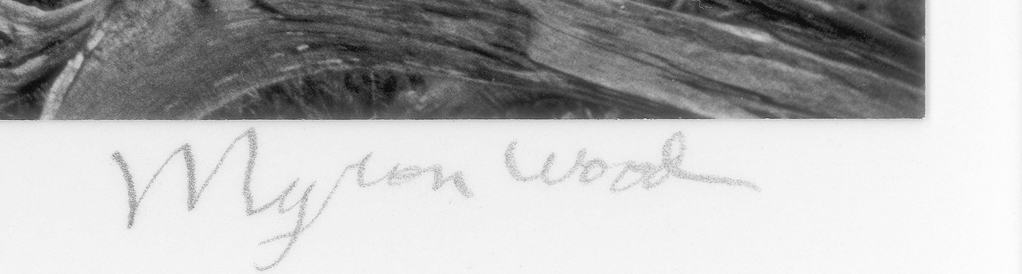 The clarity and sharpness of this image is typically attributed to large format 8x10 negatives, though Myron Wood utilized small format 35mm cameras predominantly throughout his career. Eastman Kodak provided him film, considered “experimental" at the time, which produced a superfine grain structure and an expanded tonal range. This is a brilliant print, rich in texture and inner light.