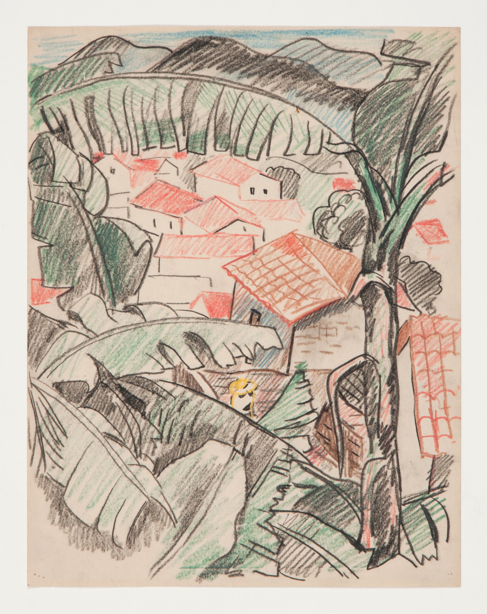 While the exact location of this drawing is unknown, Kinzinger taught a Landscape course in Taxco, Mexico in 1930. It was during this time that Kinzinger realized he needed to mix his Italian painting with Mexican motifs. In 1942, Kinzinger finished his PhD at the University of Iowa where his dissertation focused on his theories about Mexican motif painting. Kinzinger spent the summer of 1944 in Mexico, working on his Mexican motif paintings. From this timeline, we think it is likely that this drawing was created in Mexico.