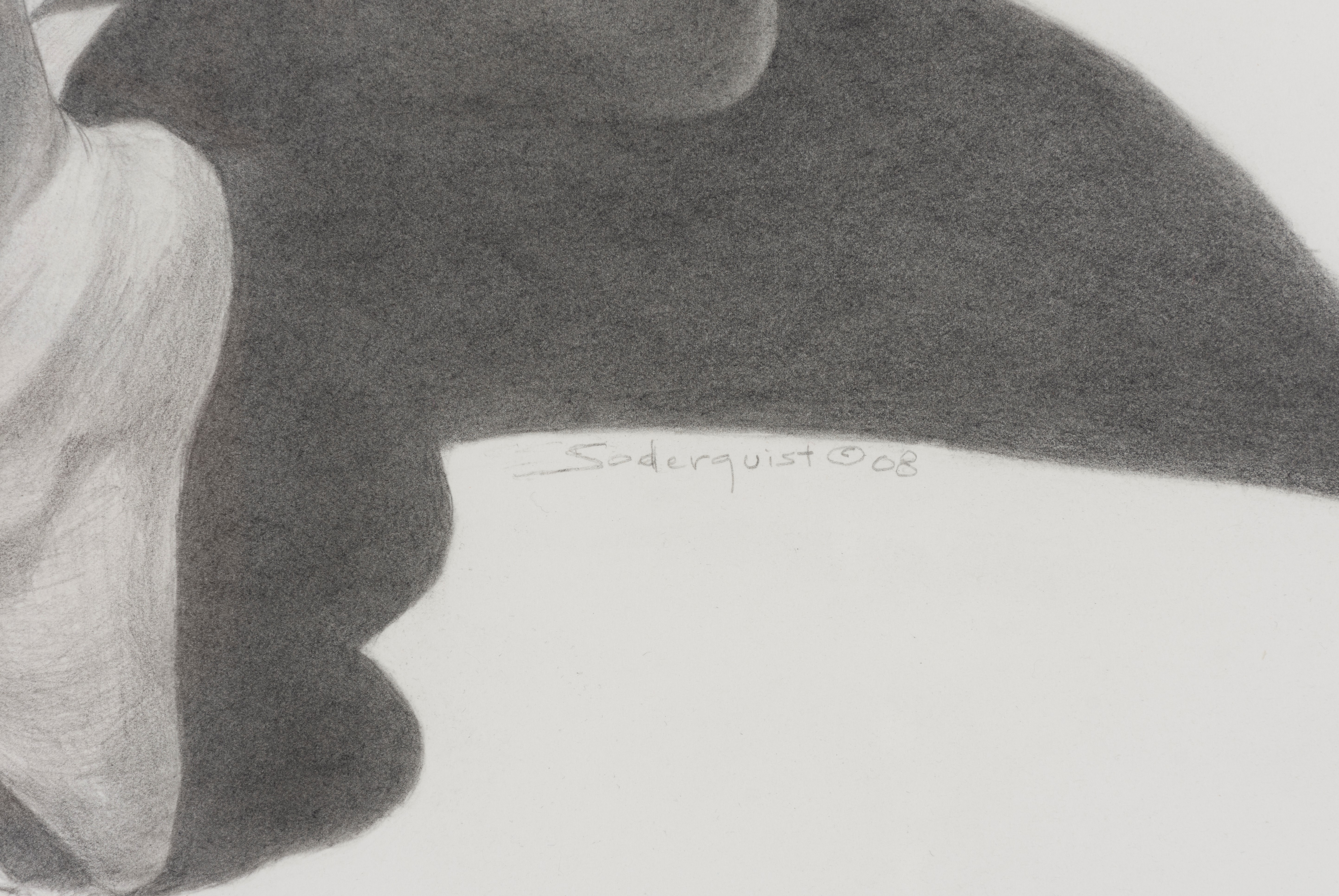 This artwork is from a series of large gestural full figure nude drawings titled, “Shadow Play,” executed between 2008 and 2010. The figures are caught in a frozen gestural pose and they cast dark shadows beneath acting as an imaginary dance partner.