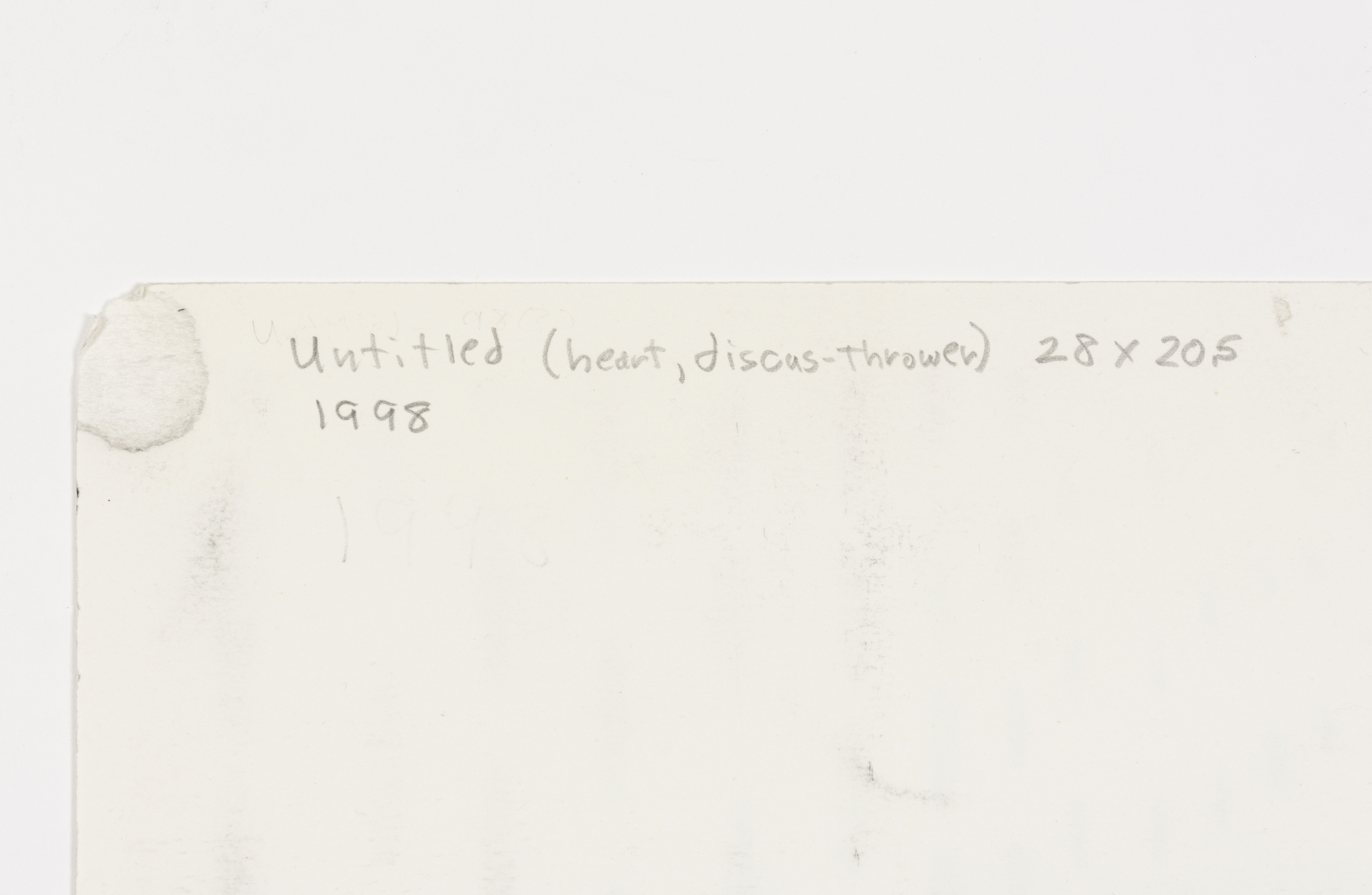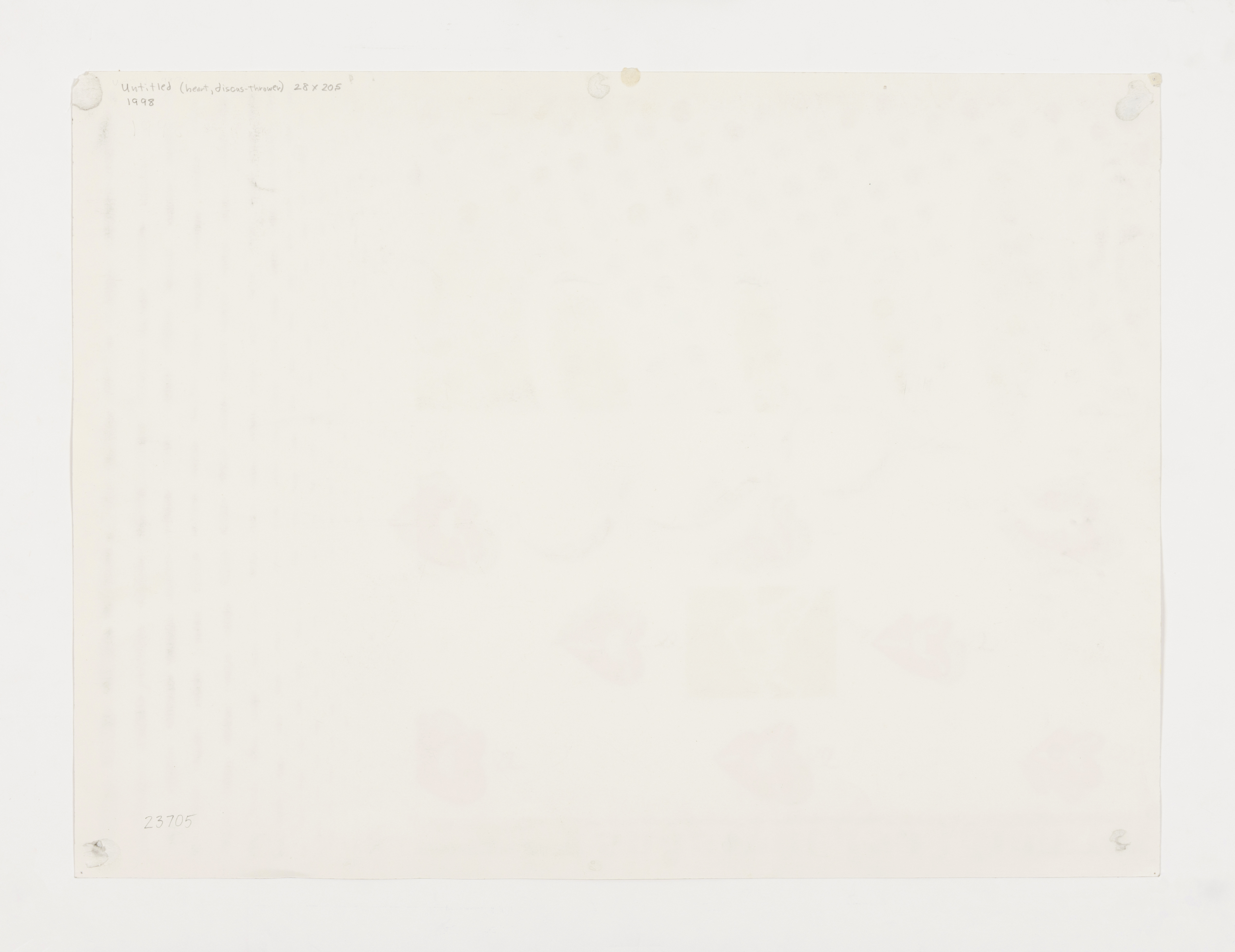 Recto: Overall image area in excellent condition. Margins have some drips and pigment stains. Paper crease in top left margin. Verso: Faint modeling from materials transfer.