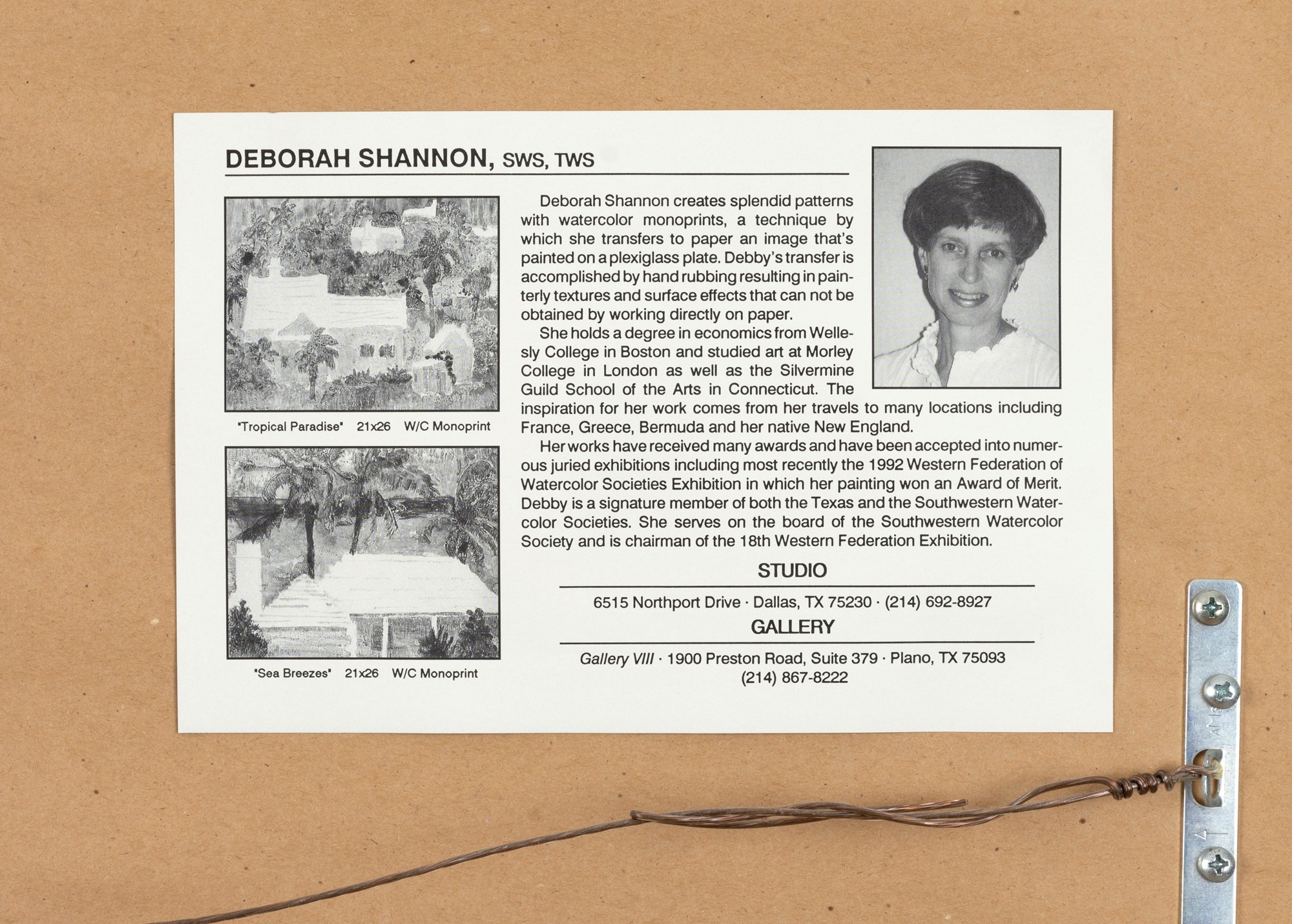 Deborah Starr Shannon’s work has won her numerous prestigious awards as well as signature membership in the Southwestern Watercolor Society, the Texas Watercolor Society, and in Associated Creative Artists. Her work has been exhibited by invitation in Milan Italy. For thirteen years she was an owner of Gallery VIII in Plano, Texas where her work was continuously exhibited. Her work is currently carried by Bee Street Gallery in Dallas and Fort Worth Texas.