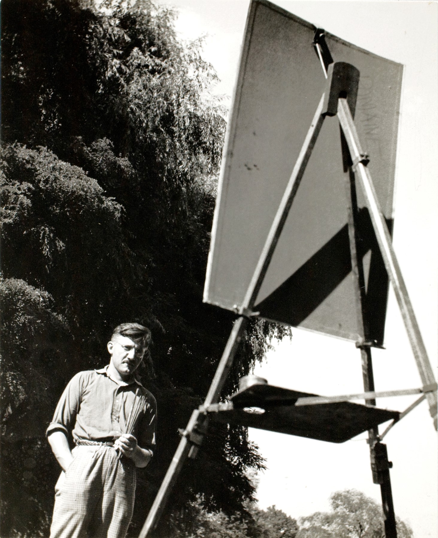 John Albok's camera of preference was a medium format, twin lens reflex typically held at chest height producing a somewhat lower camera angle in the compositions. Albok leaned further to the ground in this portrait to emphasize the painter's relationship with his work.