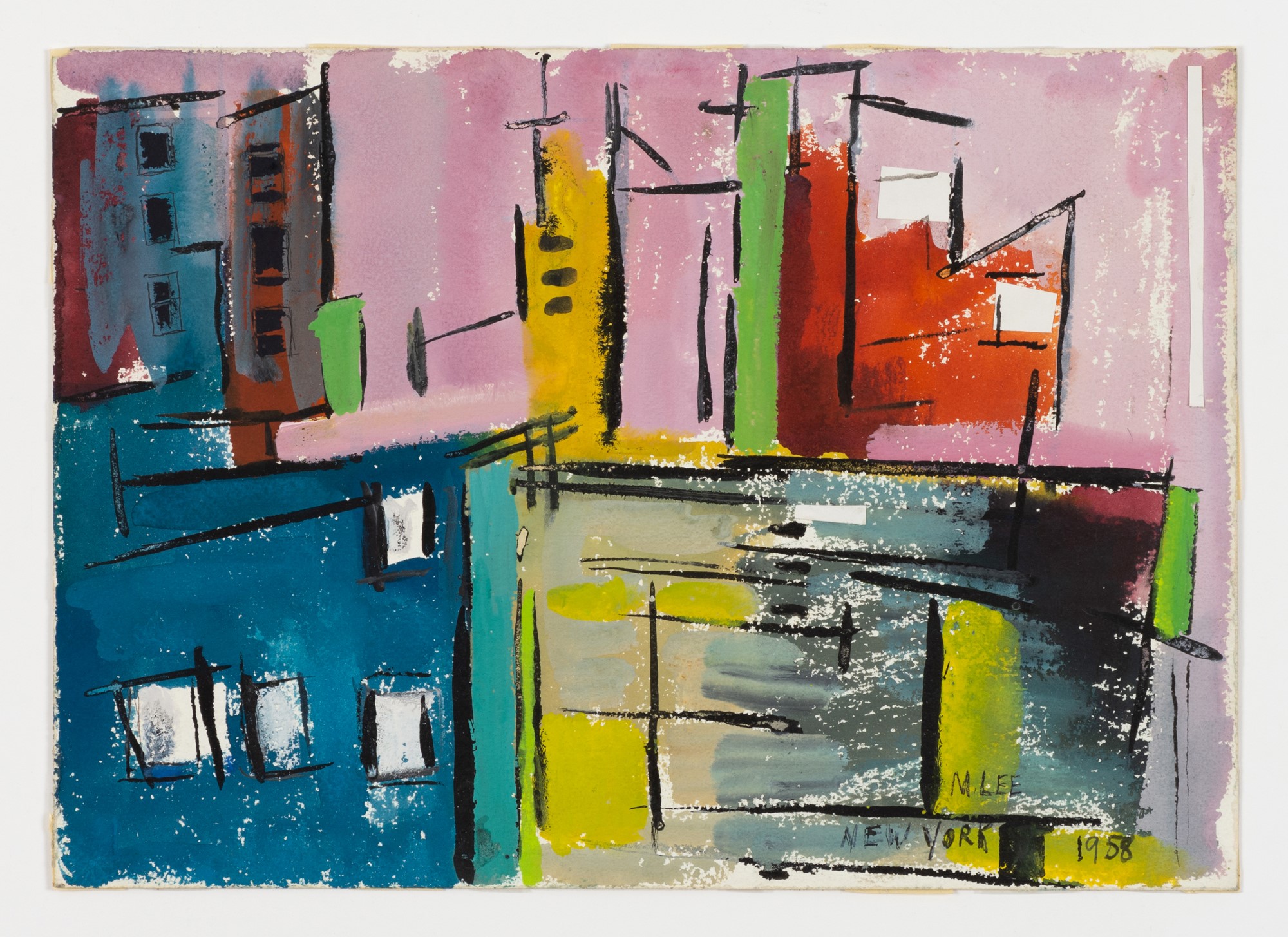 Lee was still living in New York city in 1958 when she painted this colorful abstract cityscape of buildings.