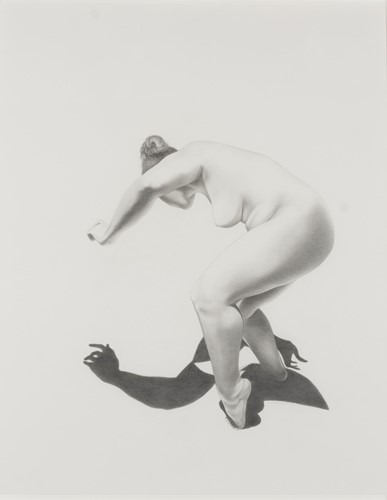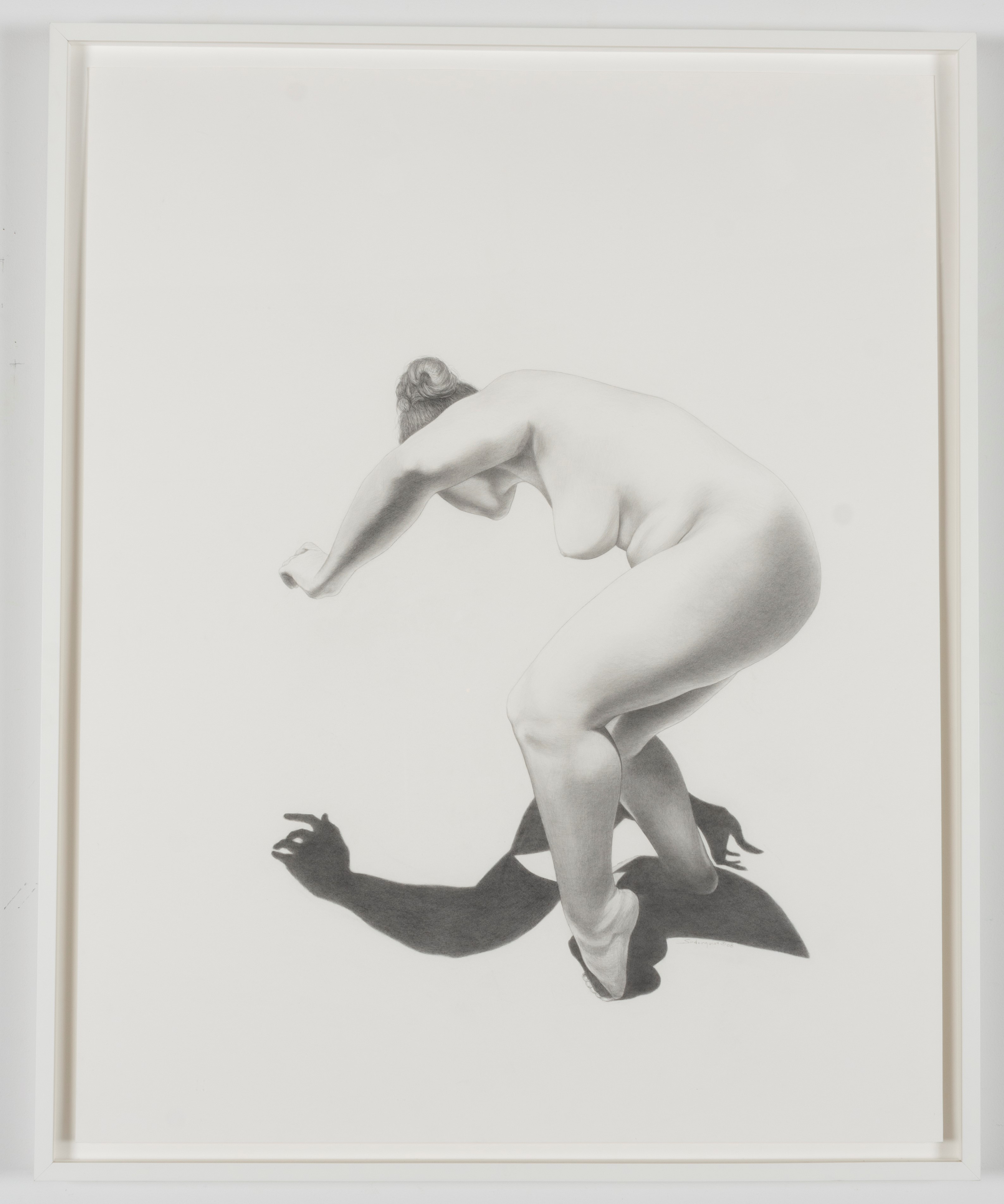 This artwork is from a series of large gestural full figure nude drawings titled, “Shadow Play,” executed between 2008 and 2010. The figures are caught in a frozen gestural pose and they cast dark shadows beneath acting as an imaginary dance partner.