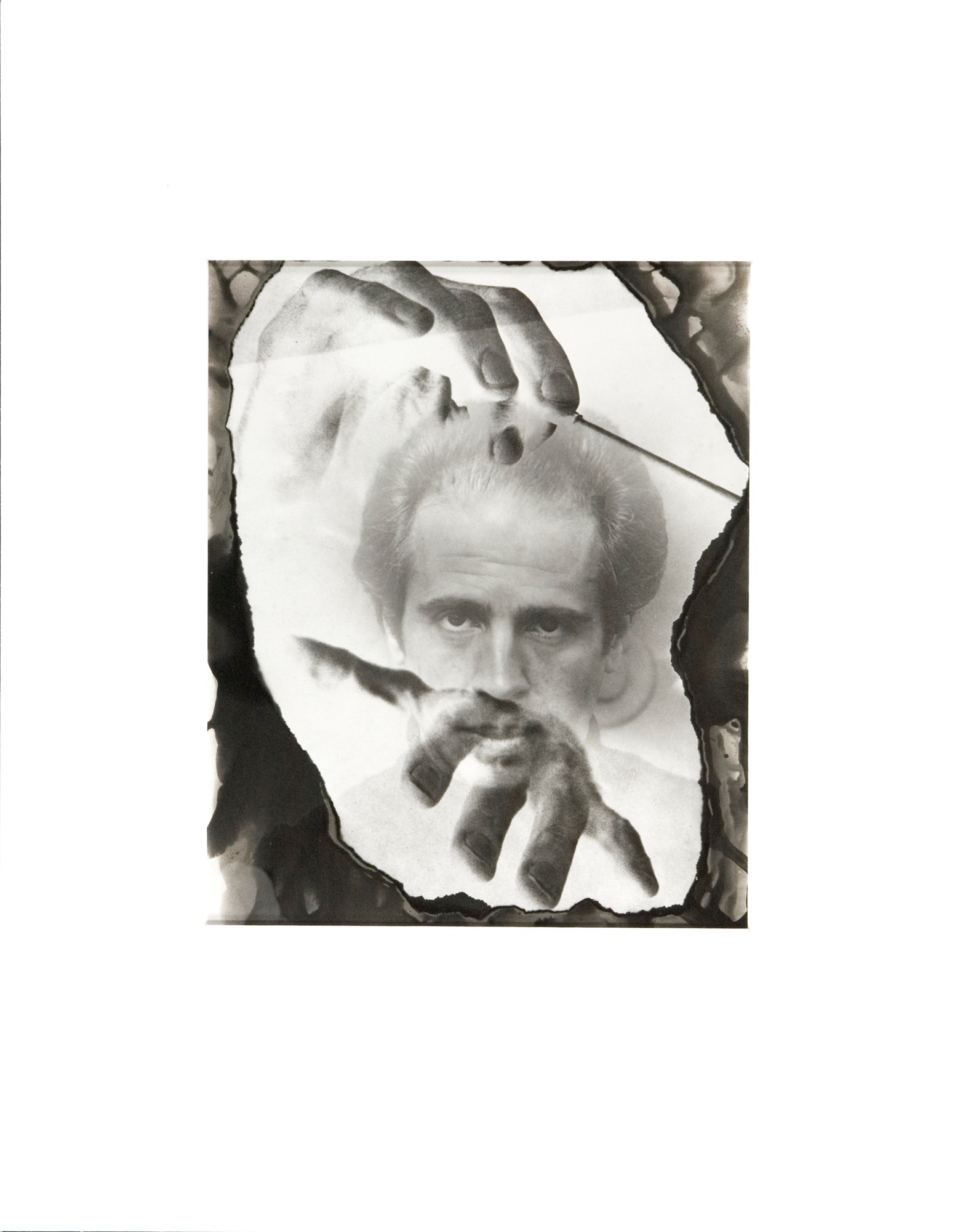 This is a unique image created from multiple negatives with a solarization technique and chemical painting on the surface of the photo paper.