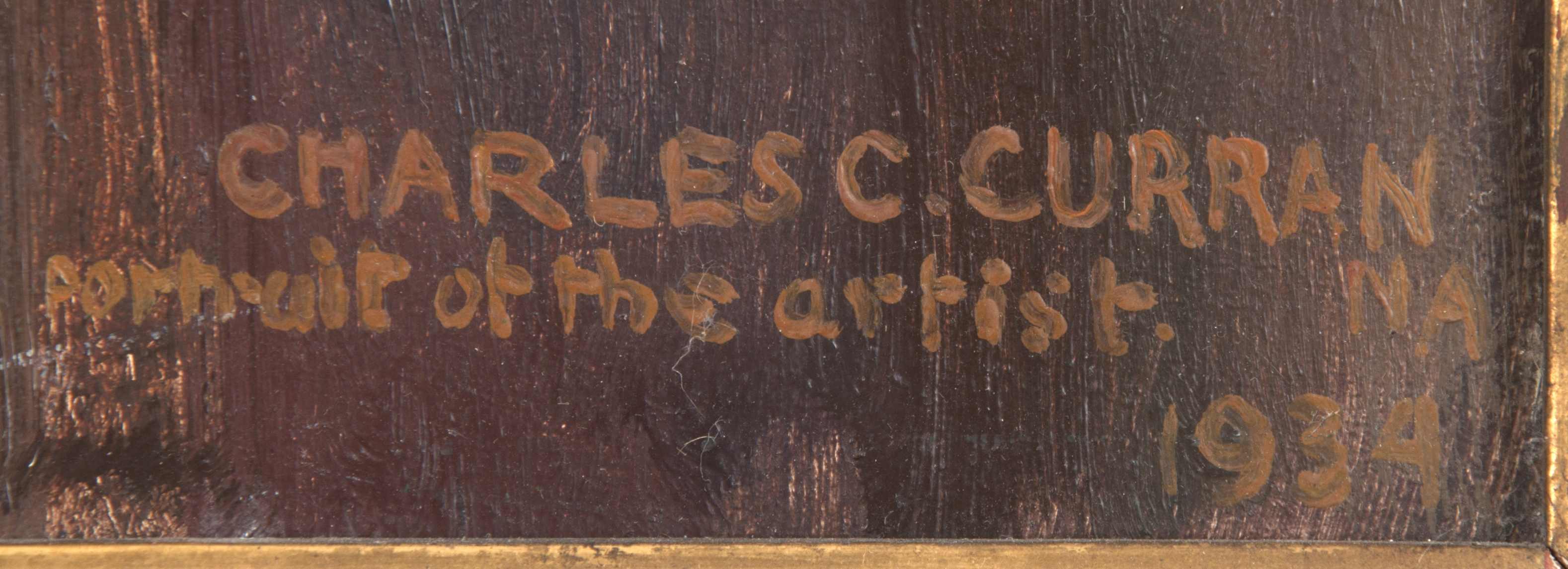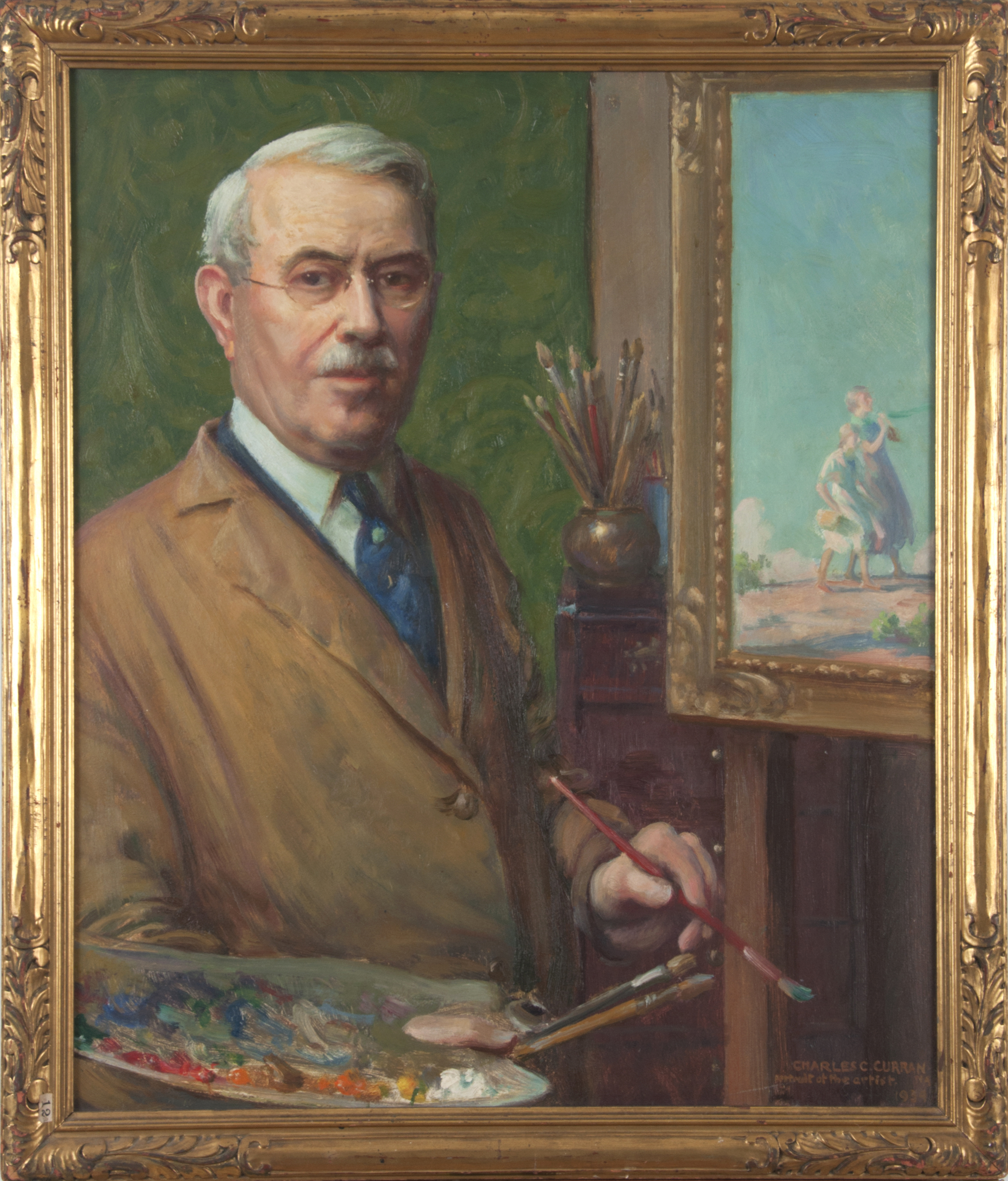 This is a self-portrait of Curran painted in 1934. The painting on the easel suggests he is in his Cragsmoor, NY studio, and that its subject matter and style are what he wanted to be remembered for as an artist.