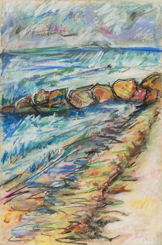 She vacationed on Martha’s Vineyard in 1950 and chose to capture her impressions of the island in pastel. She returned in 52, and this time chose watercolor, possibly more suited to the Island atmosphere.