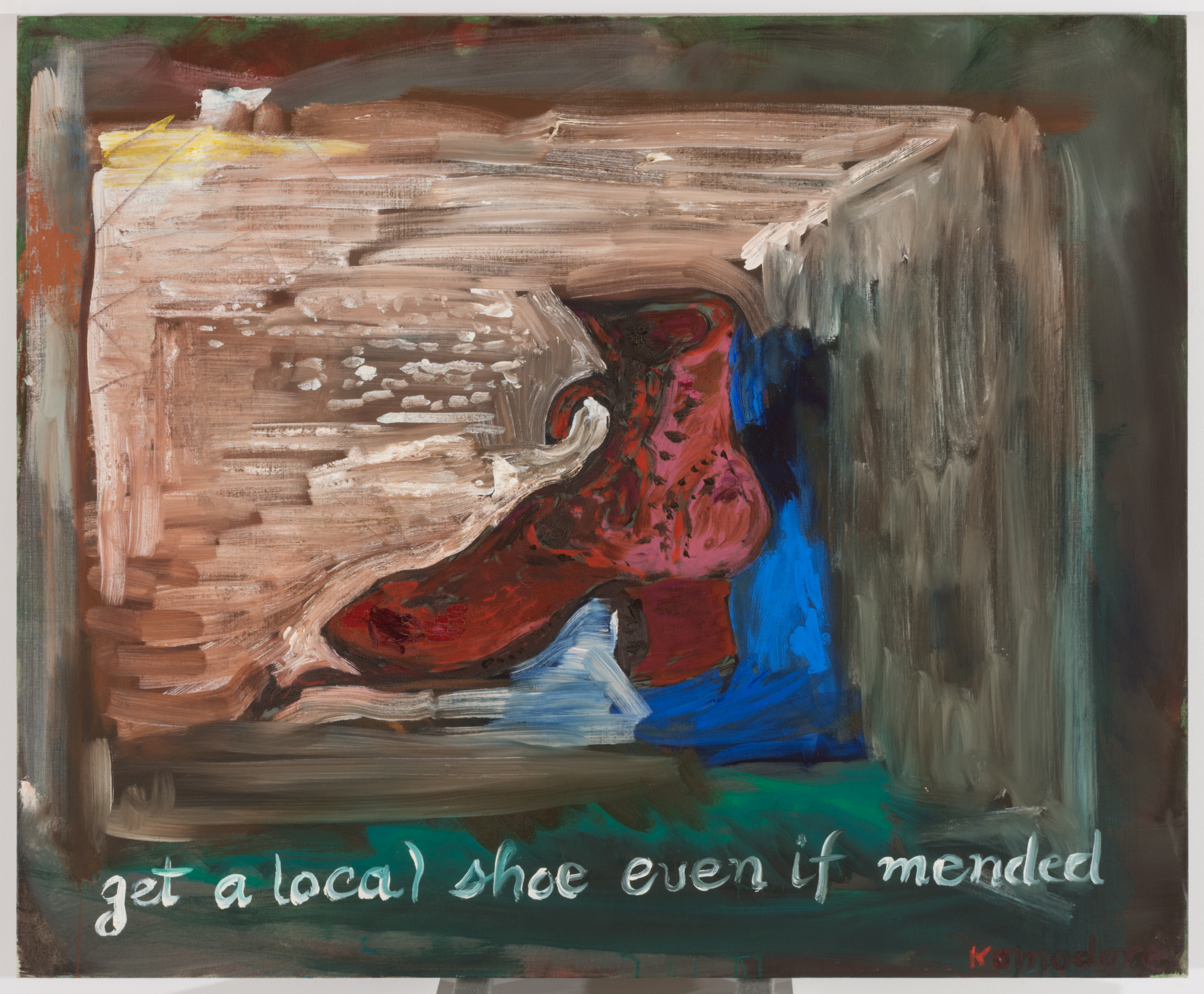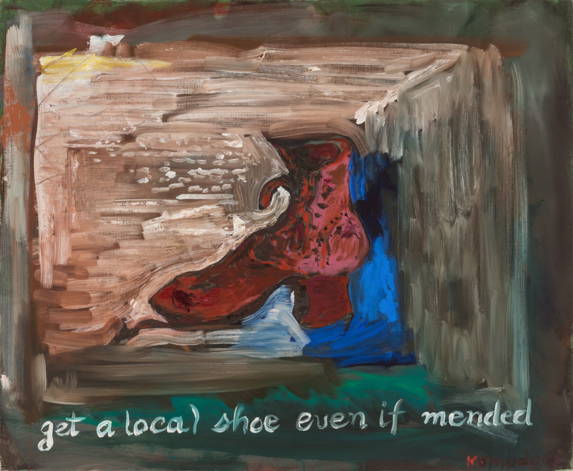 Get a Local Shoe, Even if Mended – This painting is part of a series based on the Greek proverbs Komodore grew up hearing. These pithy, whimsical and sometimes barbed aphorisms were rife with folk wisdom. Here, Komodore suggests buying art that is made locally despite a seeming paucity of snob appeal that acquisitions from New York may possess. However, like other works in Komodore’s oeuvre, this is also a study on memory, specifically the memory of his grandfather’s shoe store in Athens.