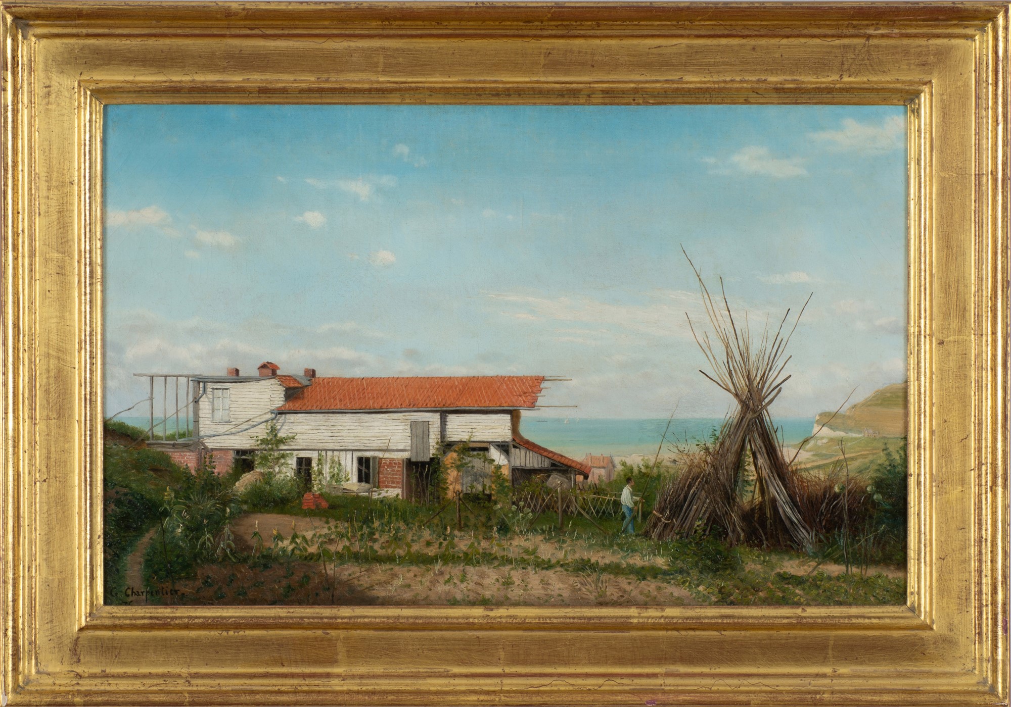 This beautiful and very highly detailed painting is most likely a Summer house on the northern coast of France. The house appears to still be under construction as a man walks past a vegetable garden on his way to add another pole to poll stack. In the landscape beyond, other more substantial buildings can be seen an there are three boats on the ocean defined horizon line at the center of the composition.