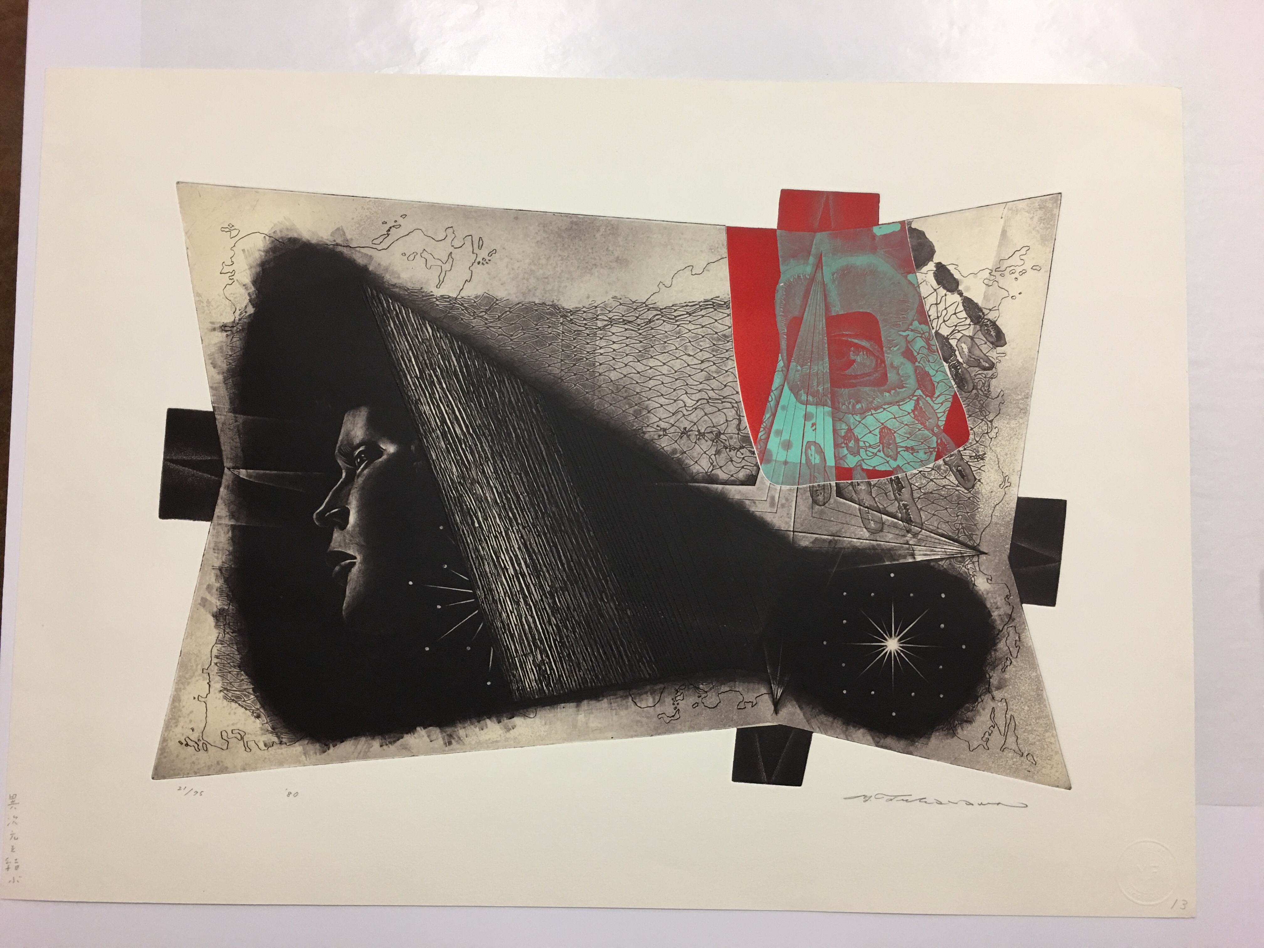Yukio Fukazawa was a lauded Japanese print maker who is revered for his lyrical and mysterious Intaglio prints. He is known for his skill and fearlessness in combining many intaglio techniques, with both copper plate engraving and etching, in unorthodox ways. He was born in Yamanashi prefecture in Japan but went to grade school on Korea where he and Hiroo Nakahara, the owner of this print, became good friends.