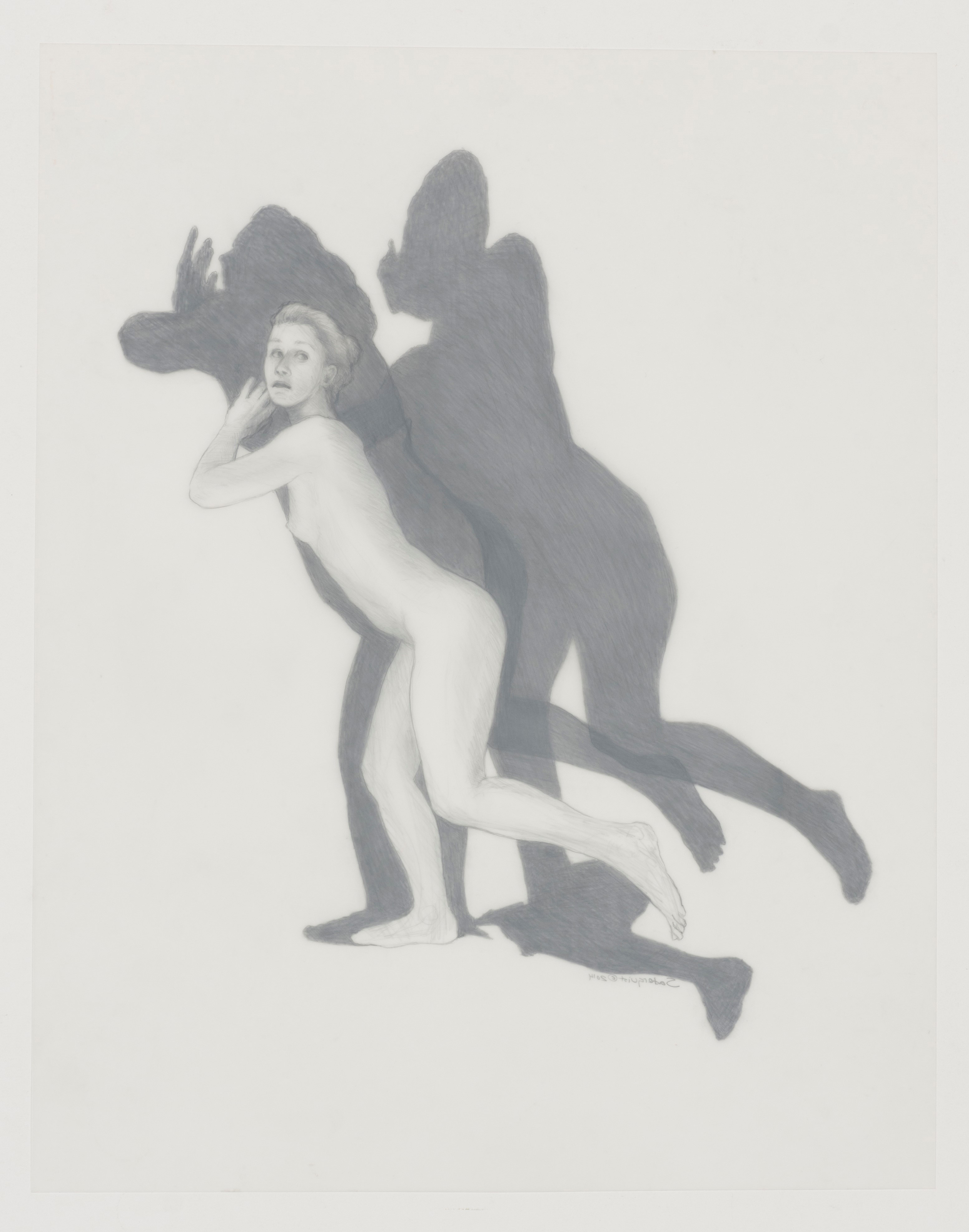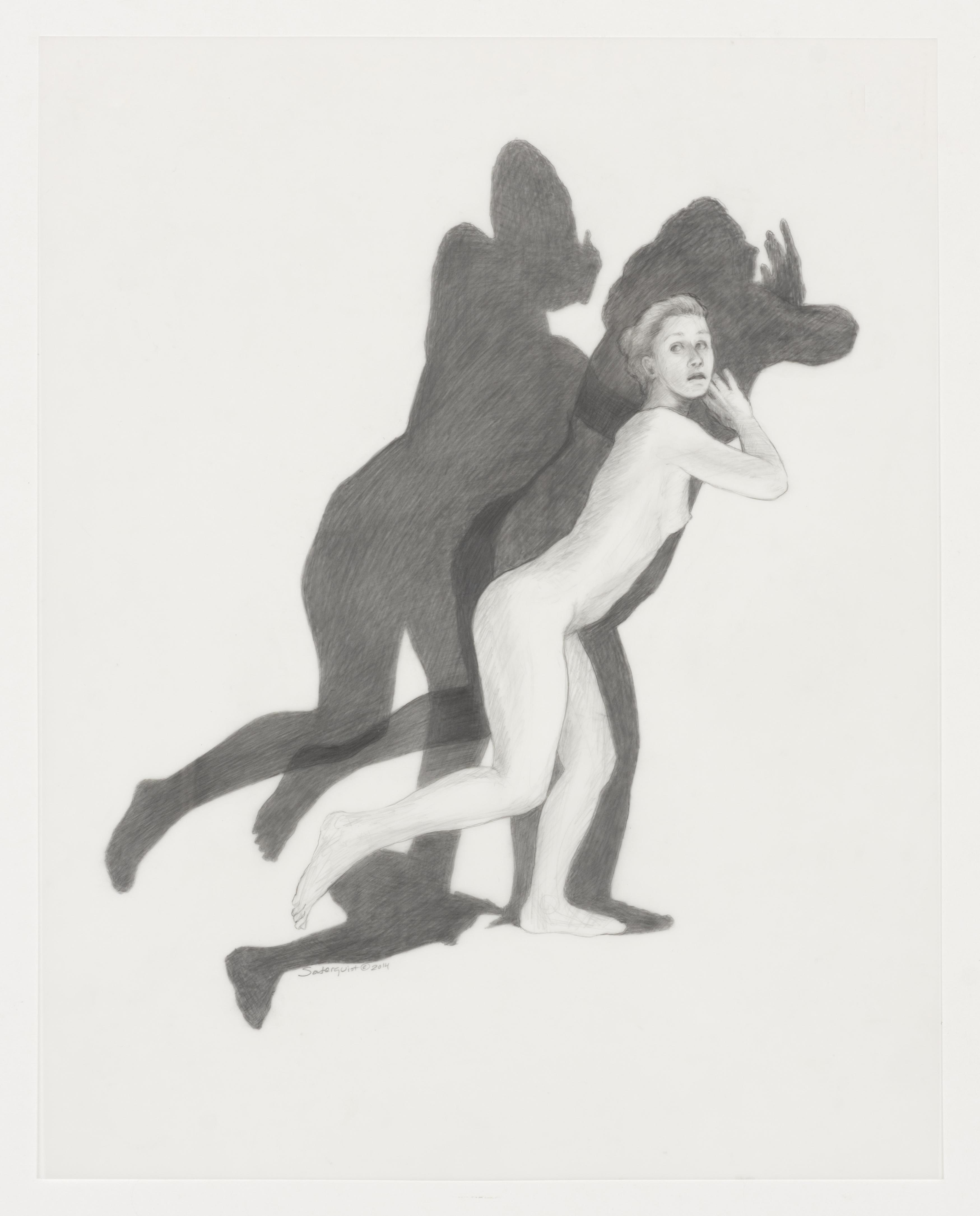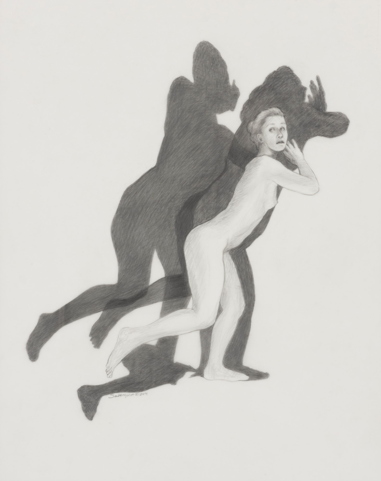 Soderquist’s “Shadow Myth” series was executed in 2014. She places nude figures juxtaposed to their dark narrative shadows. The shadows suggest the figure’s role as a character in Greek Mythology for which the drawing is named.