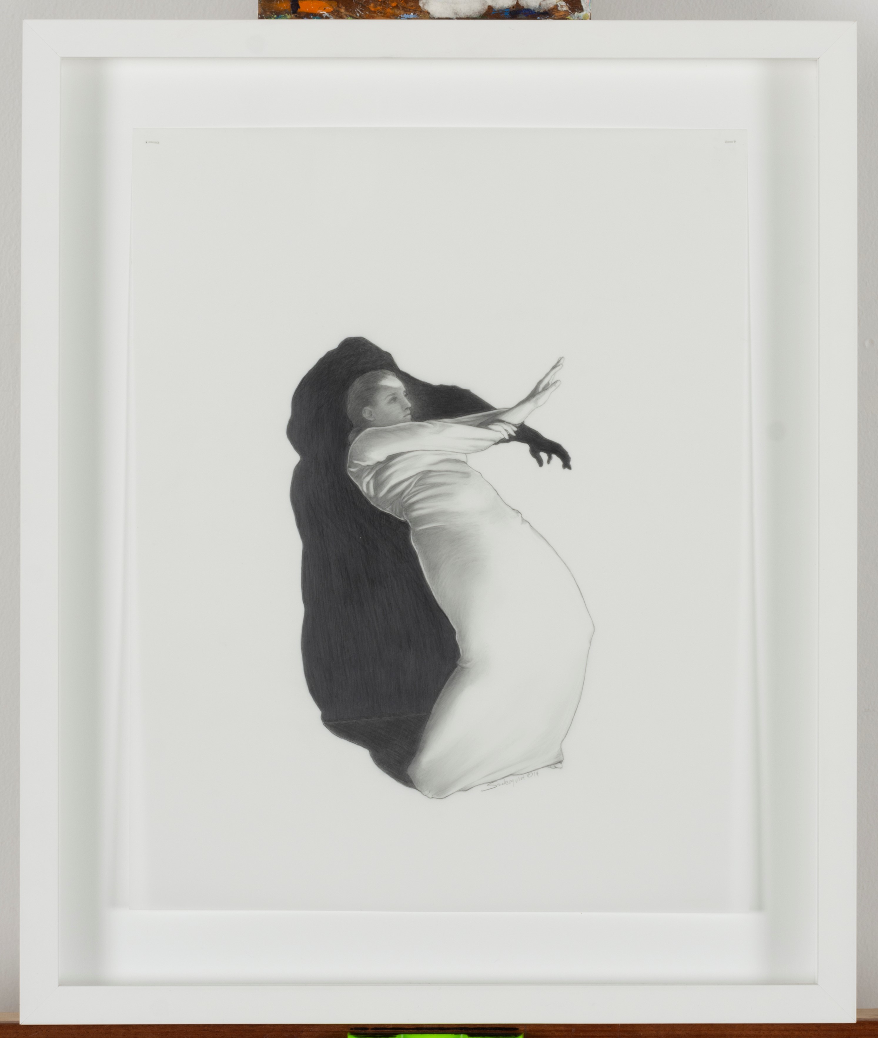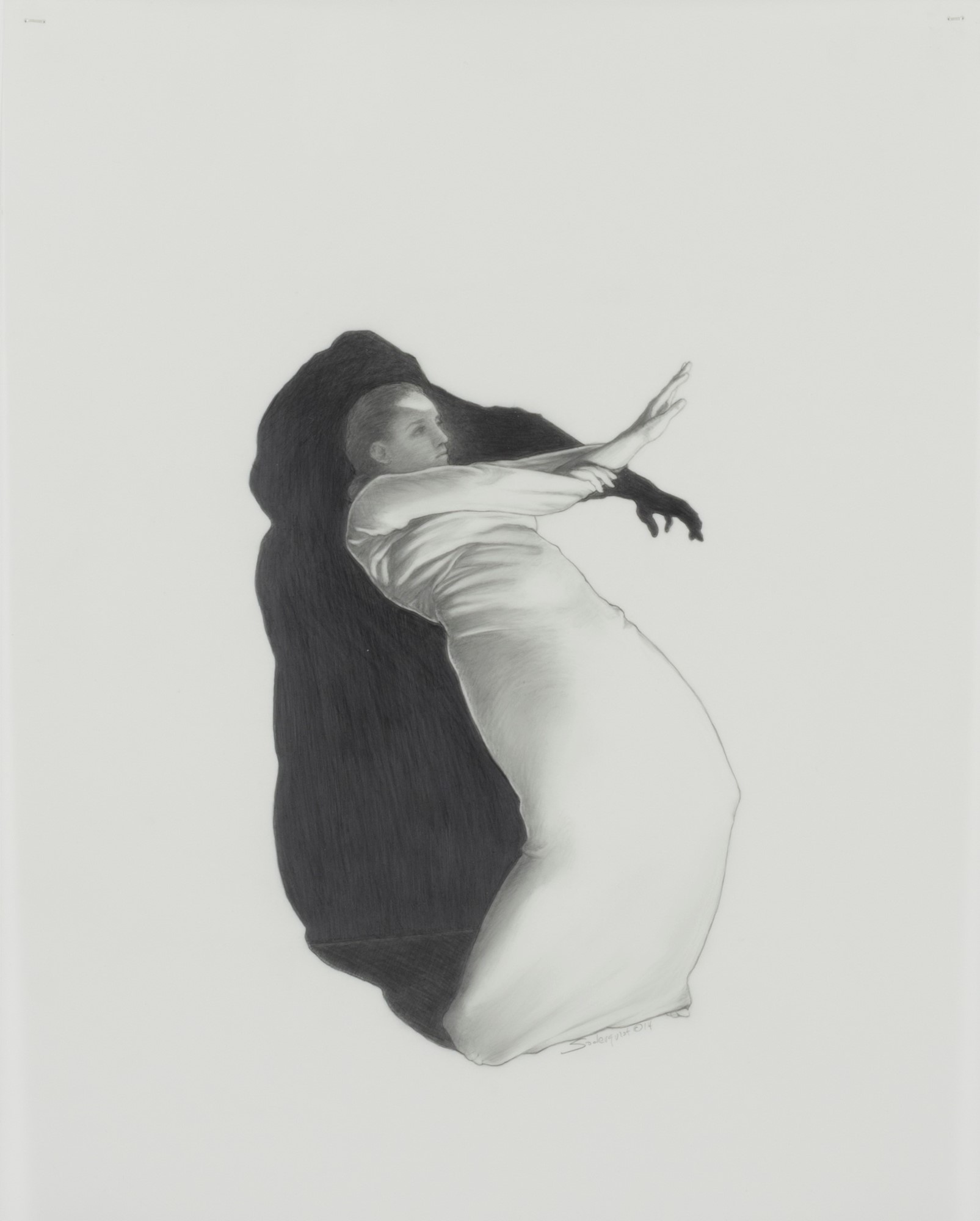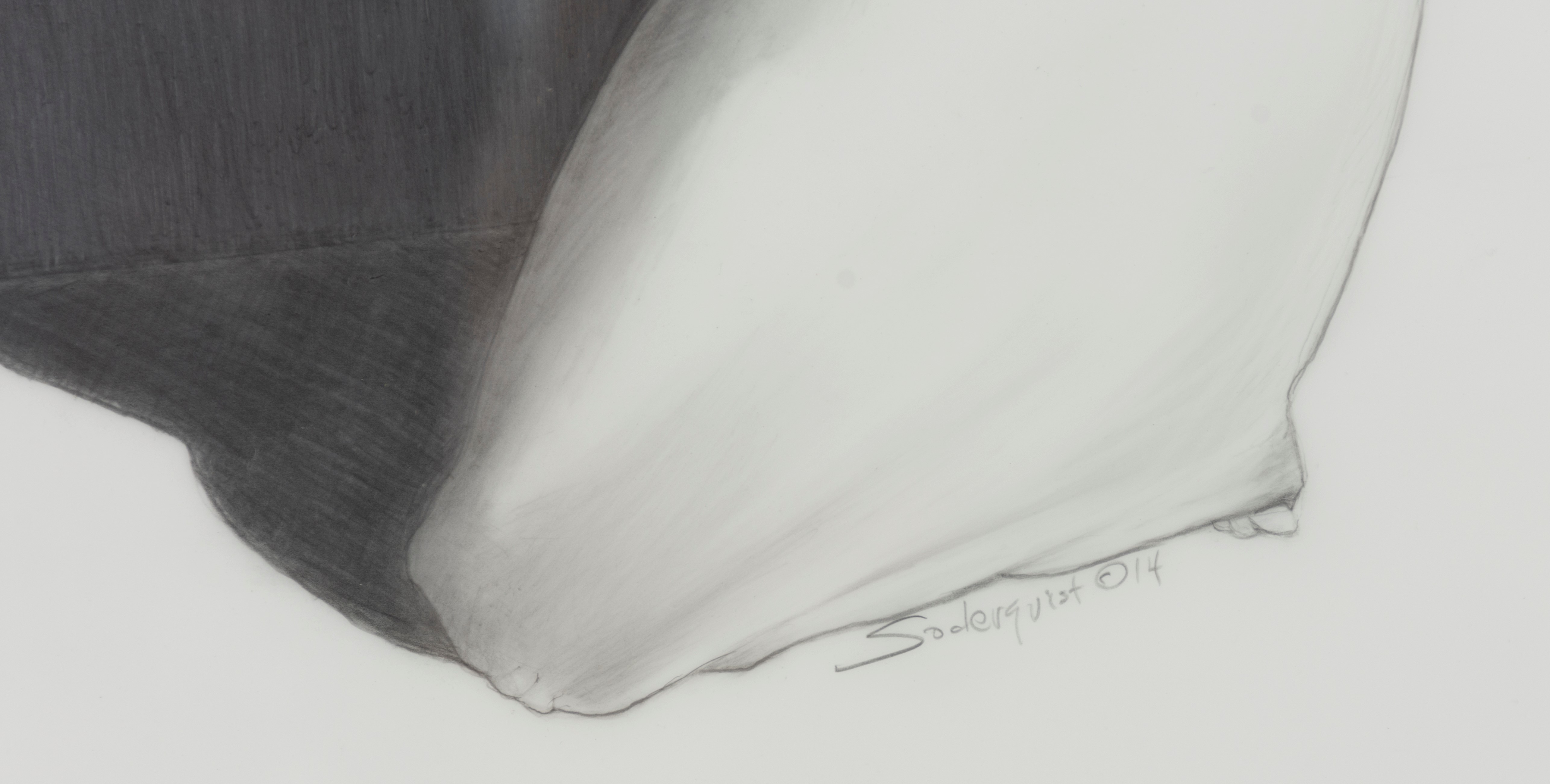 Soderquist’s “Shadow Myth” series was executed in 2014. She places nude figures juxtaposed to their dark narrative shadows. The shadows suggest the figure’s role as a character in Greek Mythology for which the drawing is named.