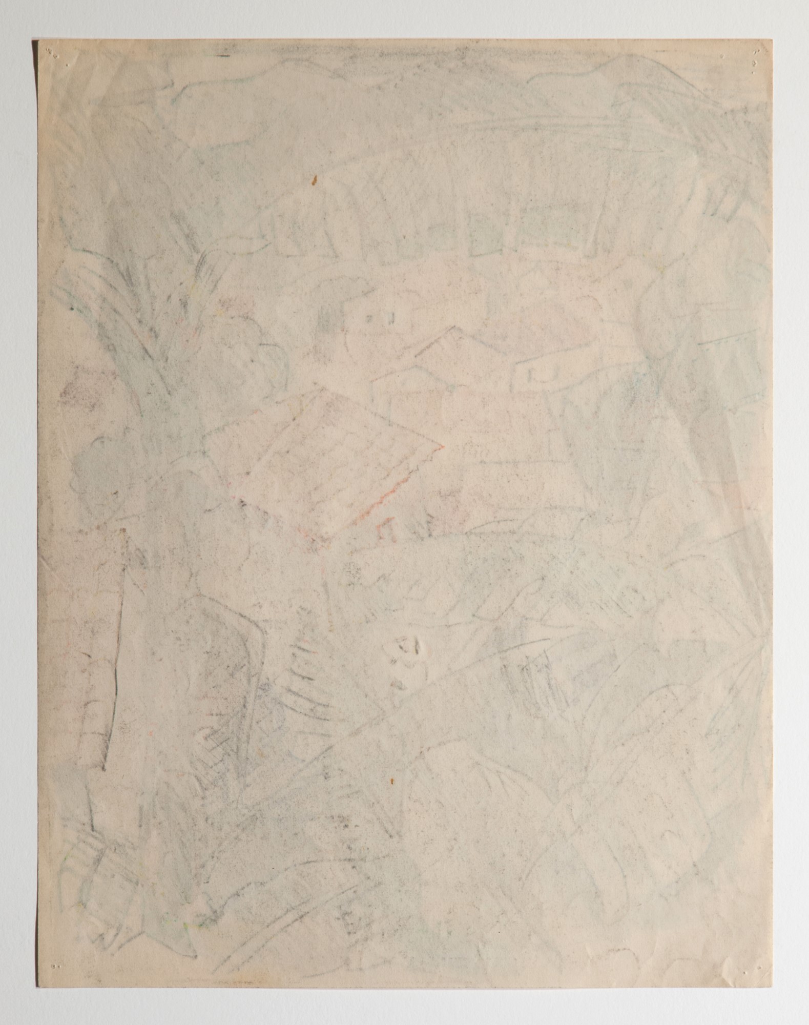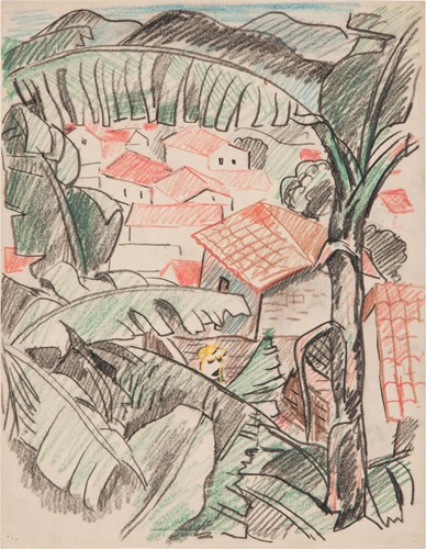 While the exact location of this drawing is unknown, Kinzinger taught a Landscape course in Taxco, Mexico in 1930. It was during this time that Kinzinger realized he needed to mix his Italian painting with Mexican motifs. In 1942, Kinzinger finished his PhD at the University of Iowa where his dissertation focused on his theories about Mexican motif painting. Kinzinger spent the summer of 1944 in Mexico, working on his Mexican motif paintings. From this timeline, we think it is likely that this drawing was created in Mexico.
