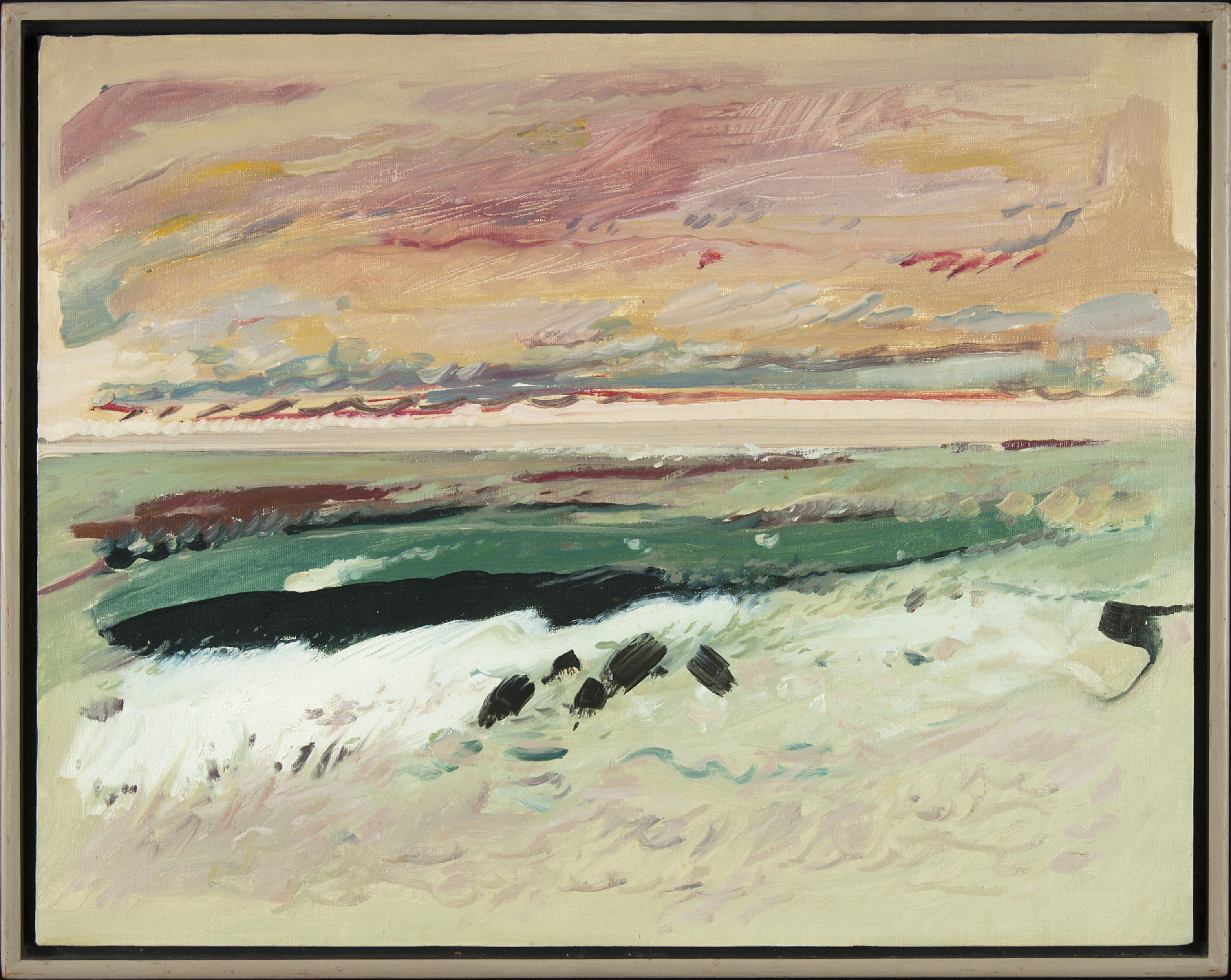 As with many of the Texas Regionalists, Maples played with surreal aspects in her works. In this case the ocean elements of the shells in the foreground become the edge of the back to the marine painting in the background.