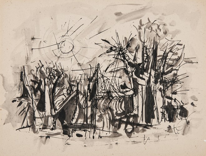 Because Everett Spruce memorized the landscapes he intended to eventually paint, he did not often use drawing as a memory tool. Most of his drawings were used to work out compositional ideas. Unlike many of Spruce's landscape paintings that focus on the vista and the enormity of the Texas landscape, his drawings are more focused on the details. All of these drawings show his interest in the land, or humans interacting with it.