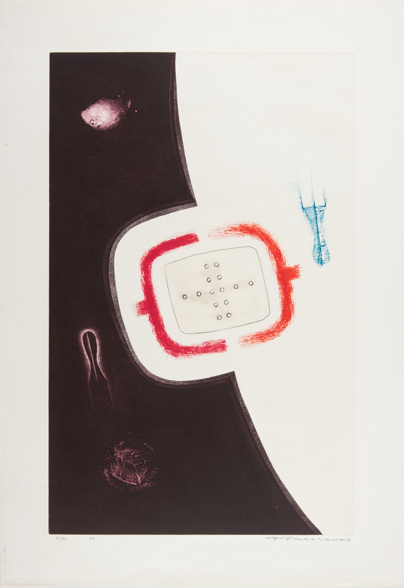 Yukio Fukazawa was a lauded Japanese print maker who is revered for his lyrical and mysterious Intaglio prints. He is known for his skill and fearlessness in combining many intaglio techniques, with both copper plate engraving and etching, in unorthodox ways. He was born in Yamanashi prefecture in Japan but went to grade school on Korea where he and Hiroo Nakahara, the owner of this print, became good friends.