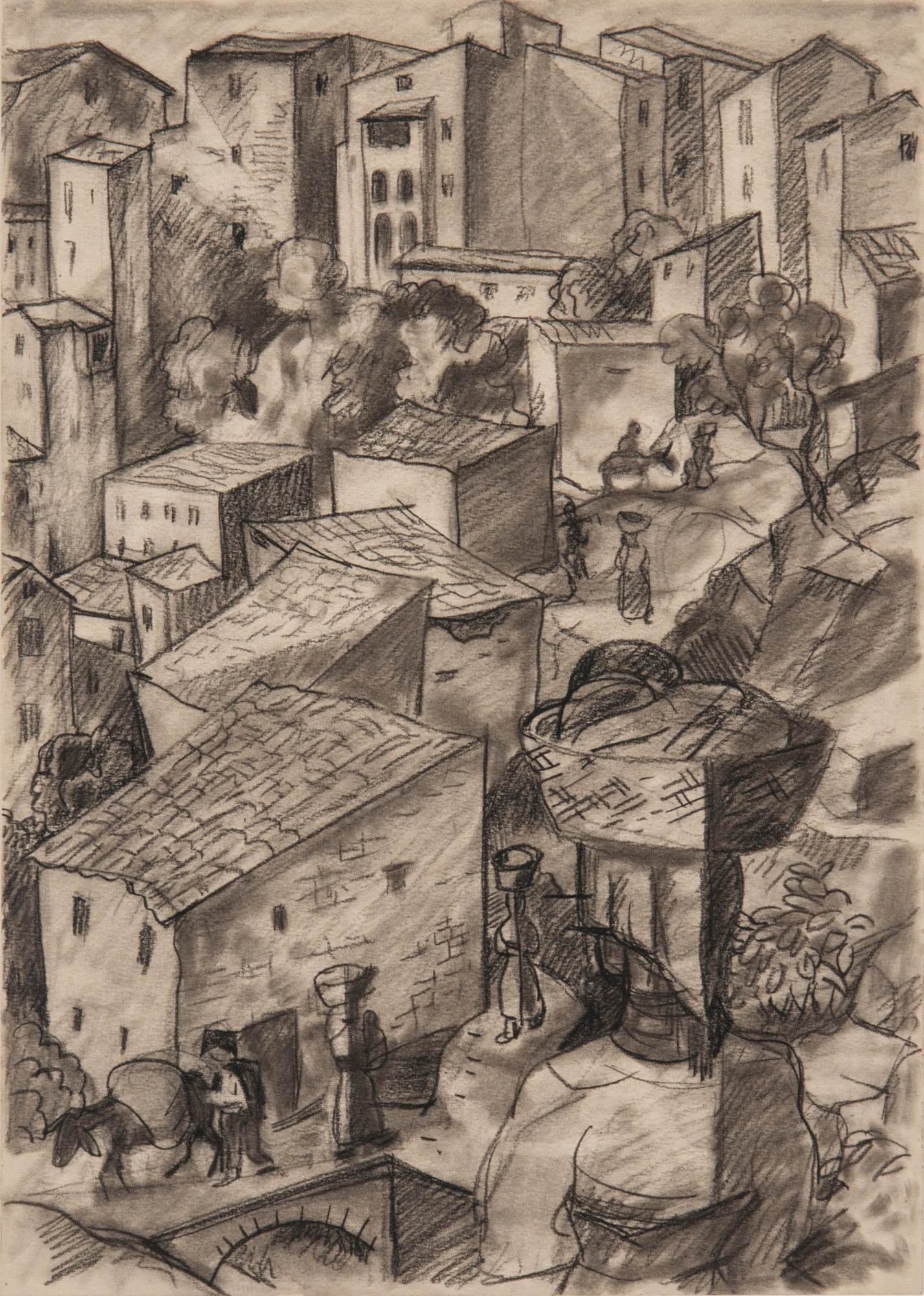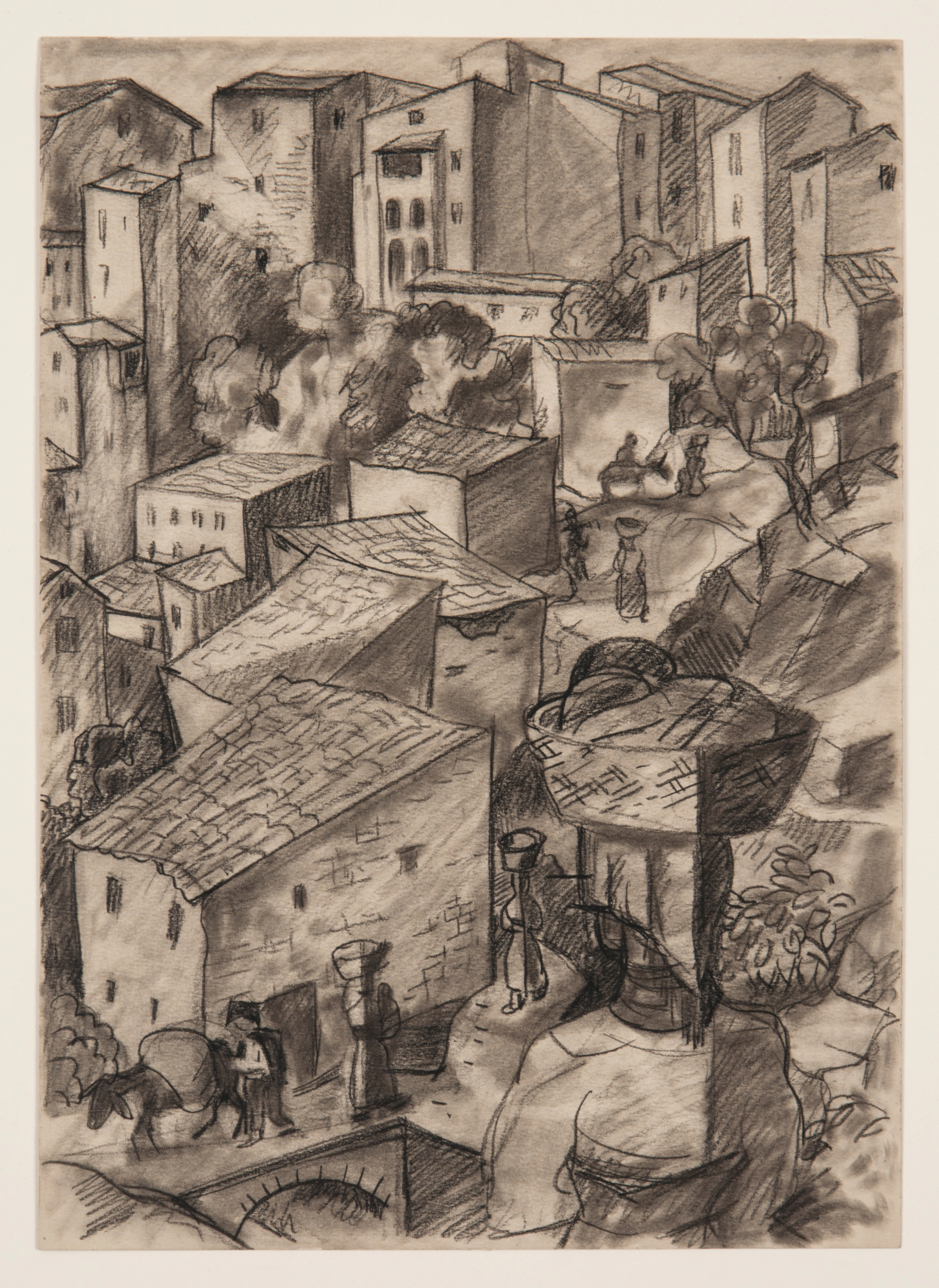 While the exact location of this drawing is unknown, Kinzinger taught a Landscape courses in Taxco, Mexico in 1930/31. It was during this time that Kinzinger realized he needed to mix his Italian painting with Mexican motifs. In 1942, Kinzinger finished his PhD at the University of Iowa where his dissertation focused on his theories about Mexican motif painting. Kinzinger spent the summer of 1944 in Mexico, working on his Mexican motif paintings. From this timeline, we think it is likely that this drawing was created in Mexico. Please see Kinzinger's Biography and Asset Files for more information.