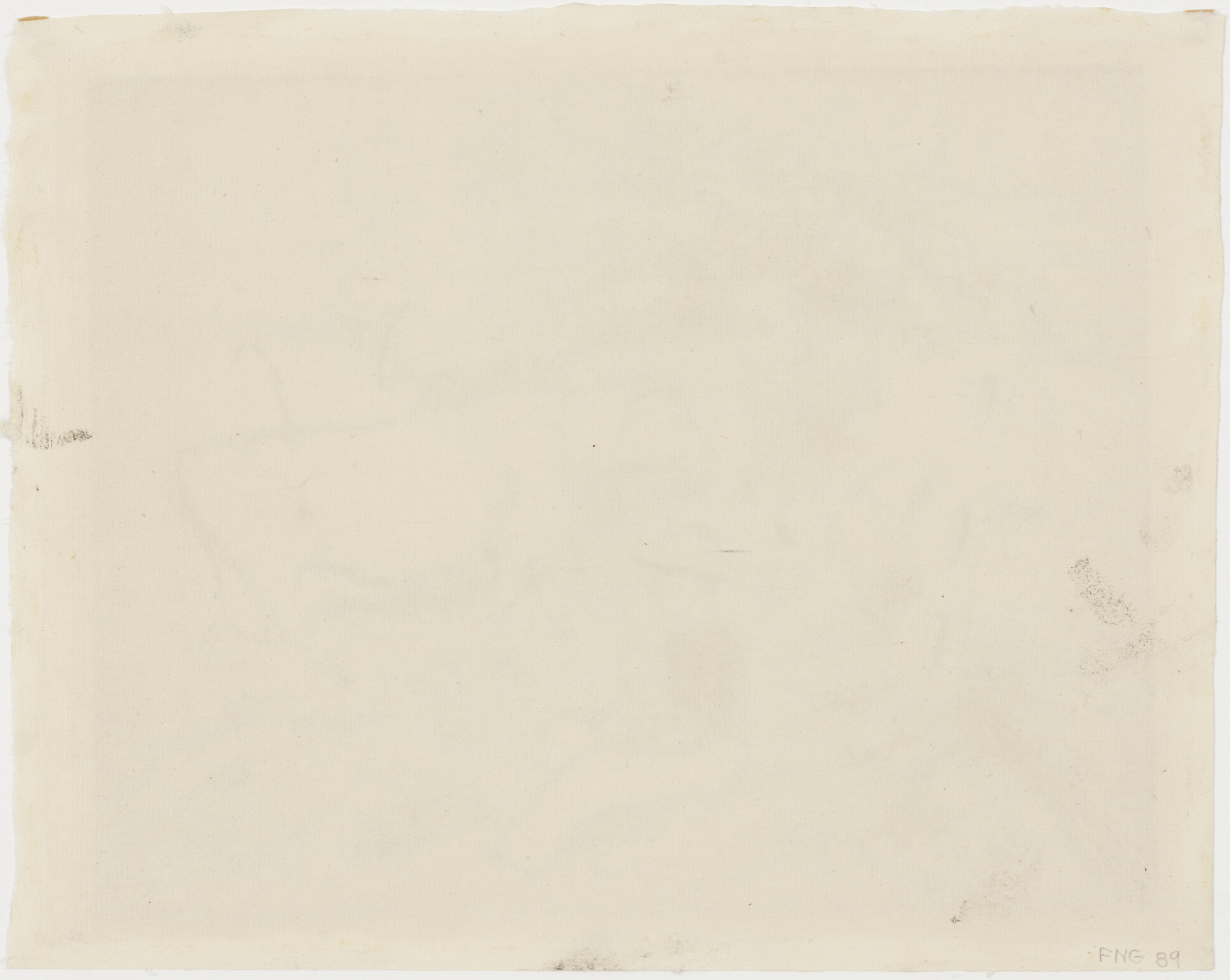 Recto: Small brown tape hinges on the upper left and the upper right corners. Ink smudge from fingerprint at bottom center of margin. Verso: Paper thinning at the top and bottom edges, most likely from tape removal. Random ink smudges at center left and lower center right.