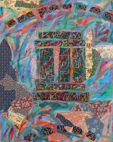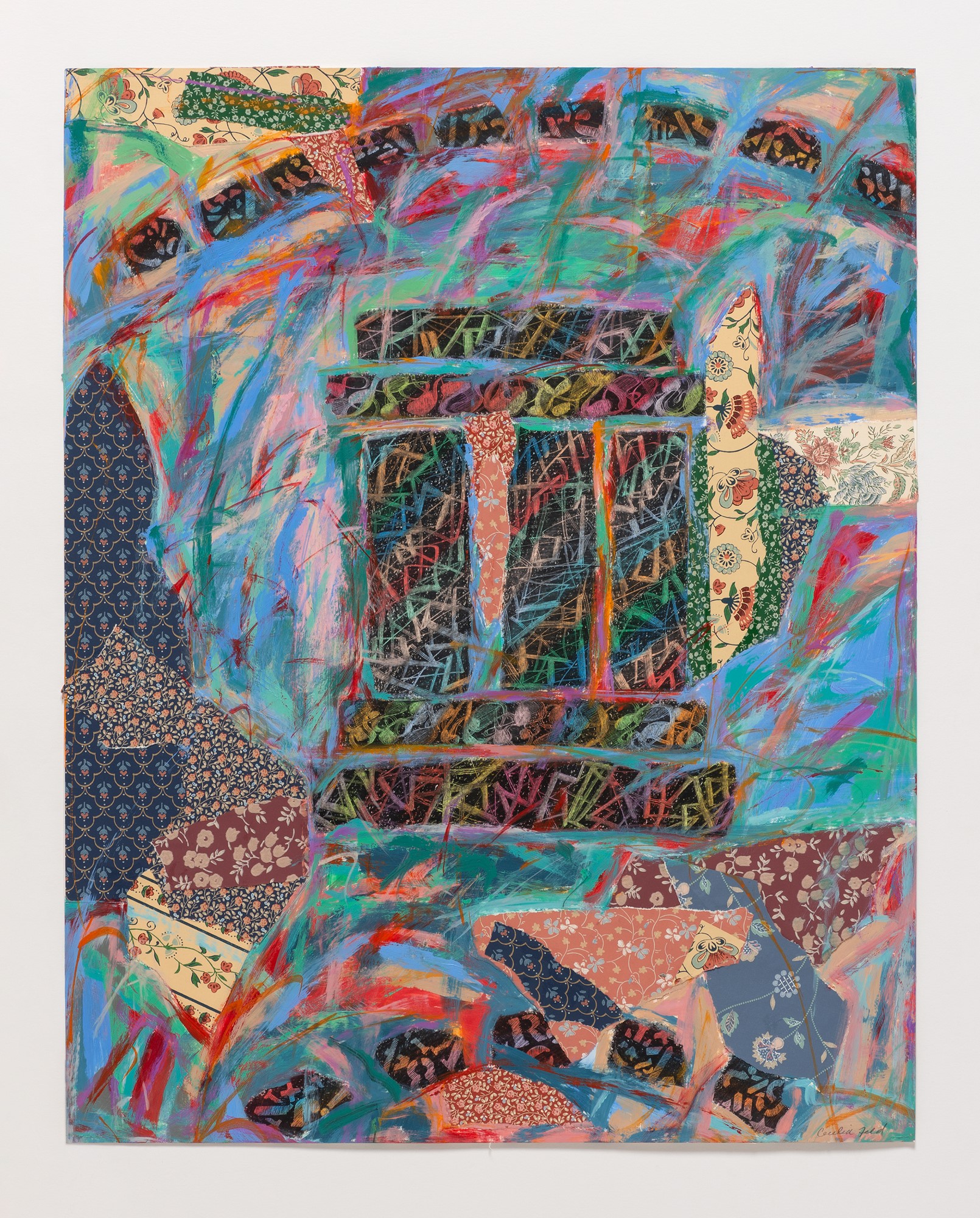 acrylic, collage, and oil crayon on paper