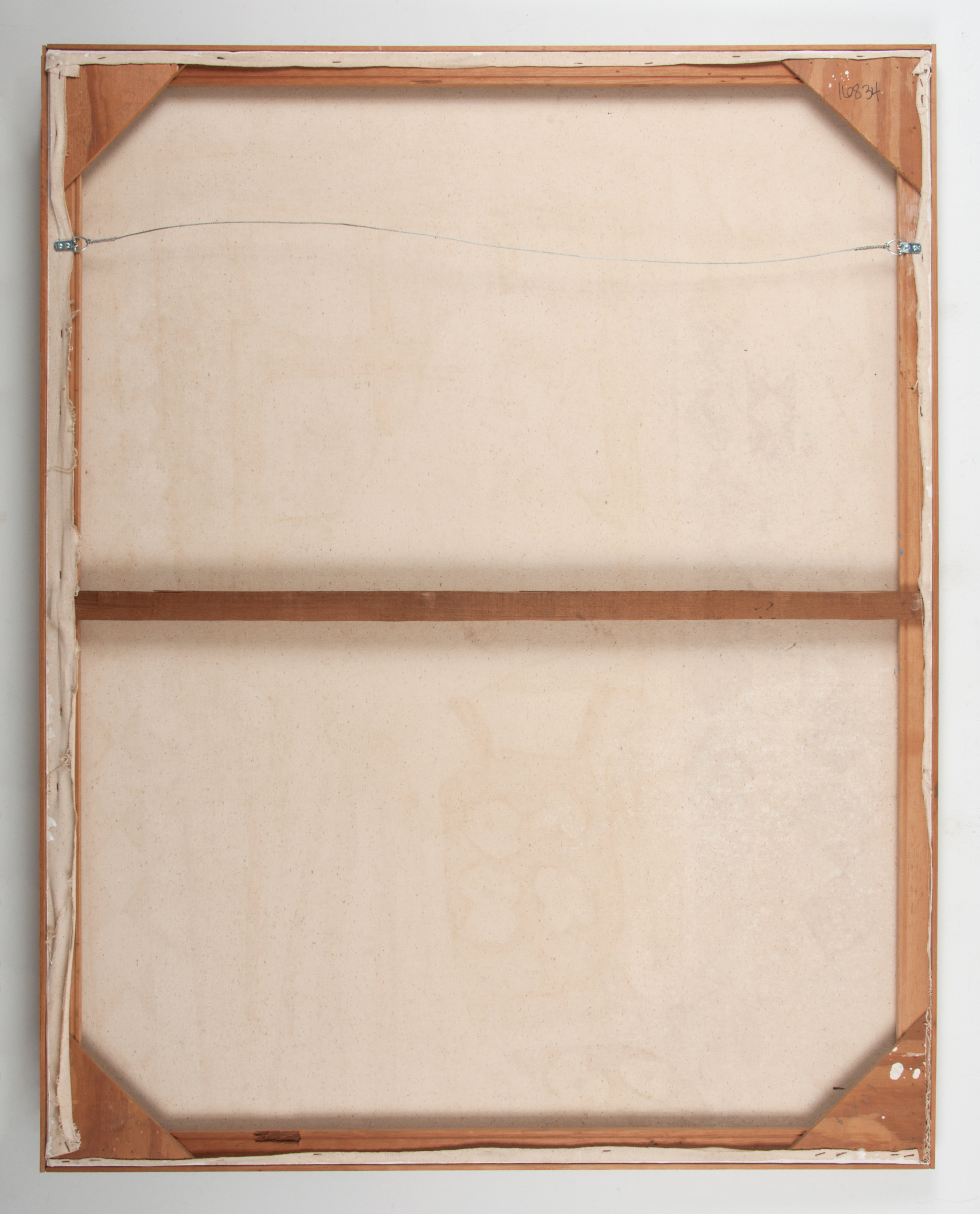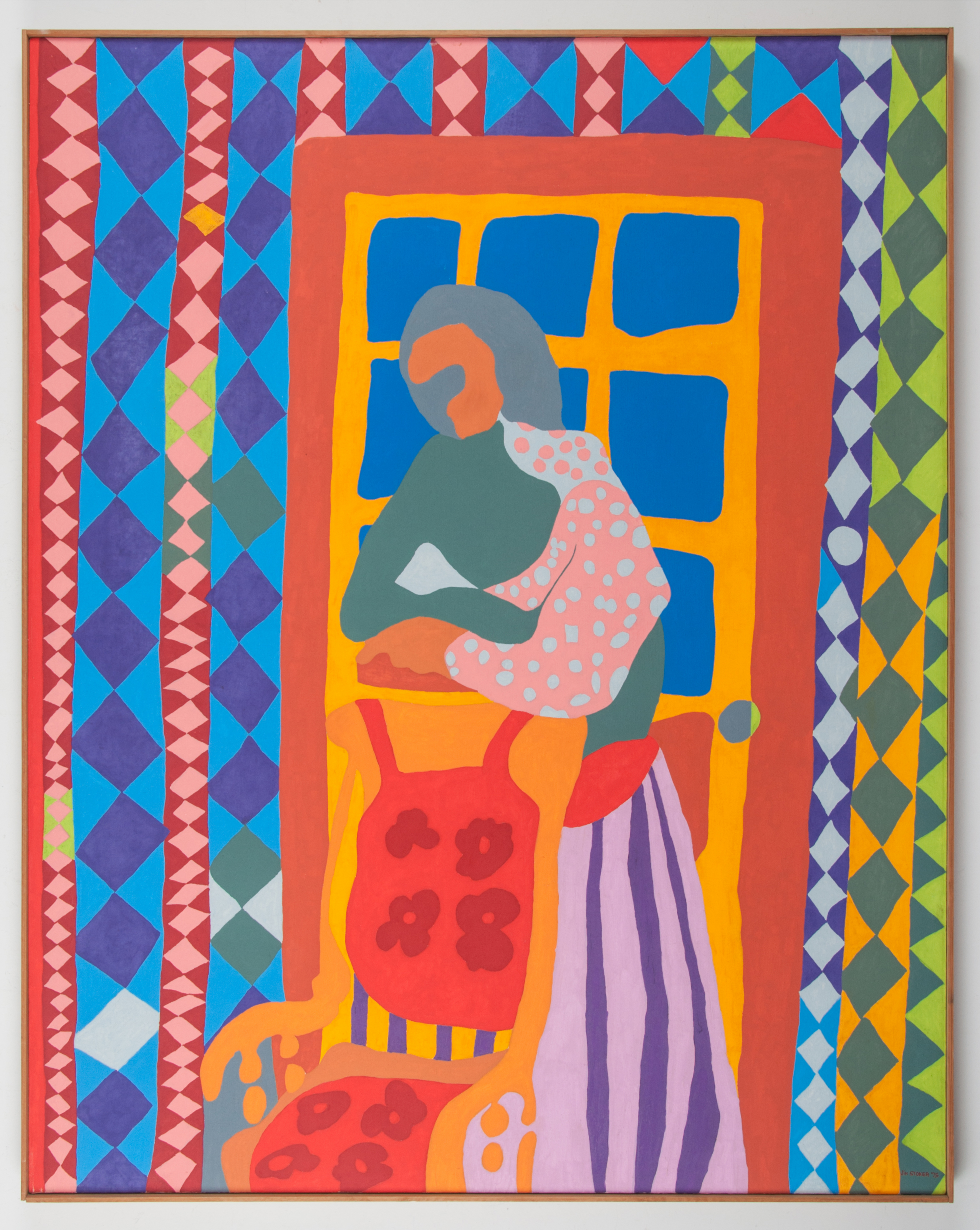 This painting is from a series done in the mid-1970s while Stoker was teaching art at Trinity University in San Antonio, Texas. The series can be identified by flat, very bright areas of color, whose subjects include elements of still life or a figure(s) in abstracted interior spaces.