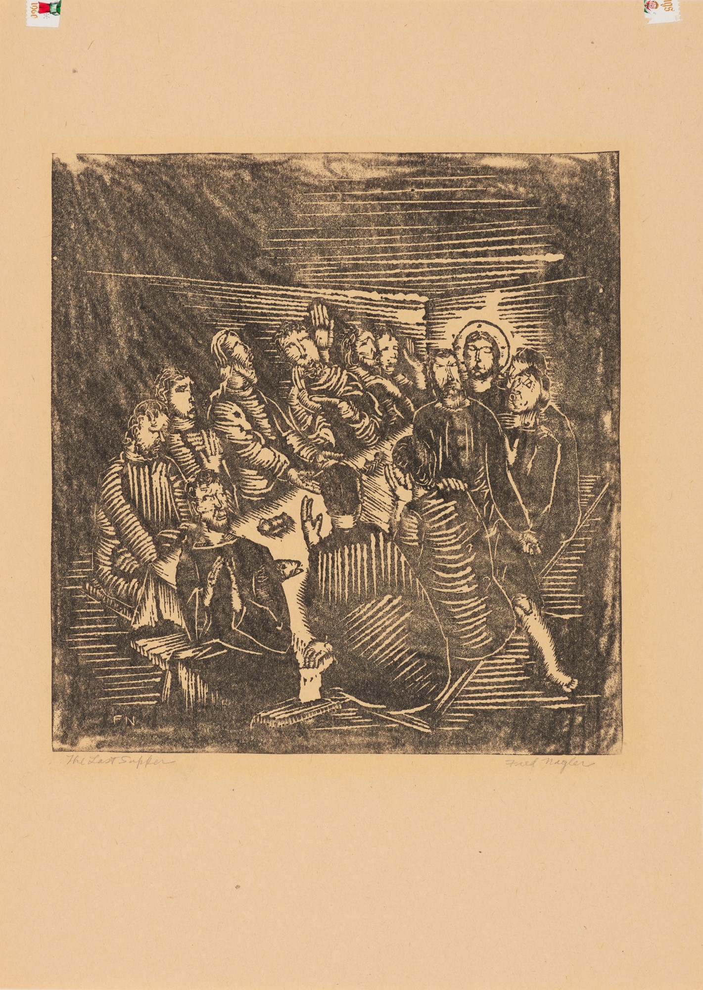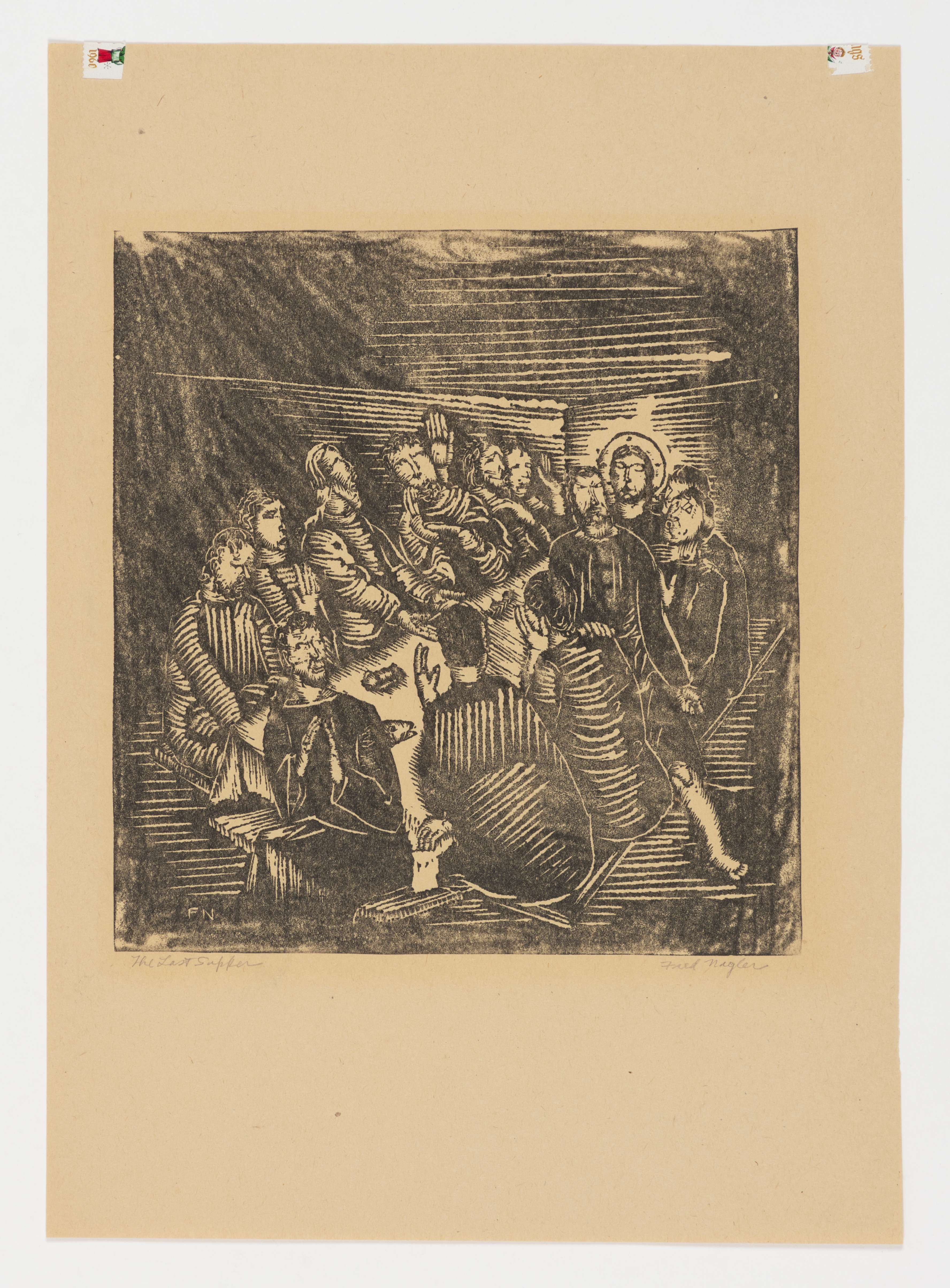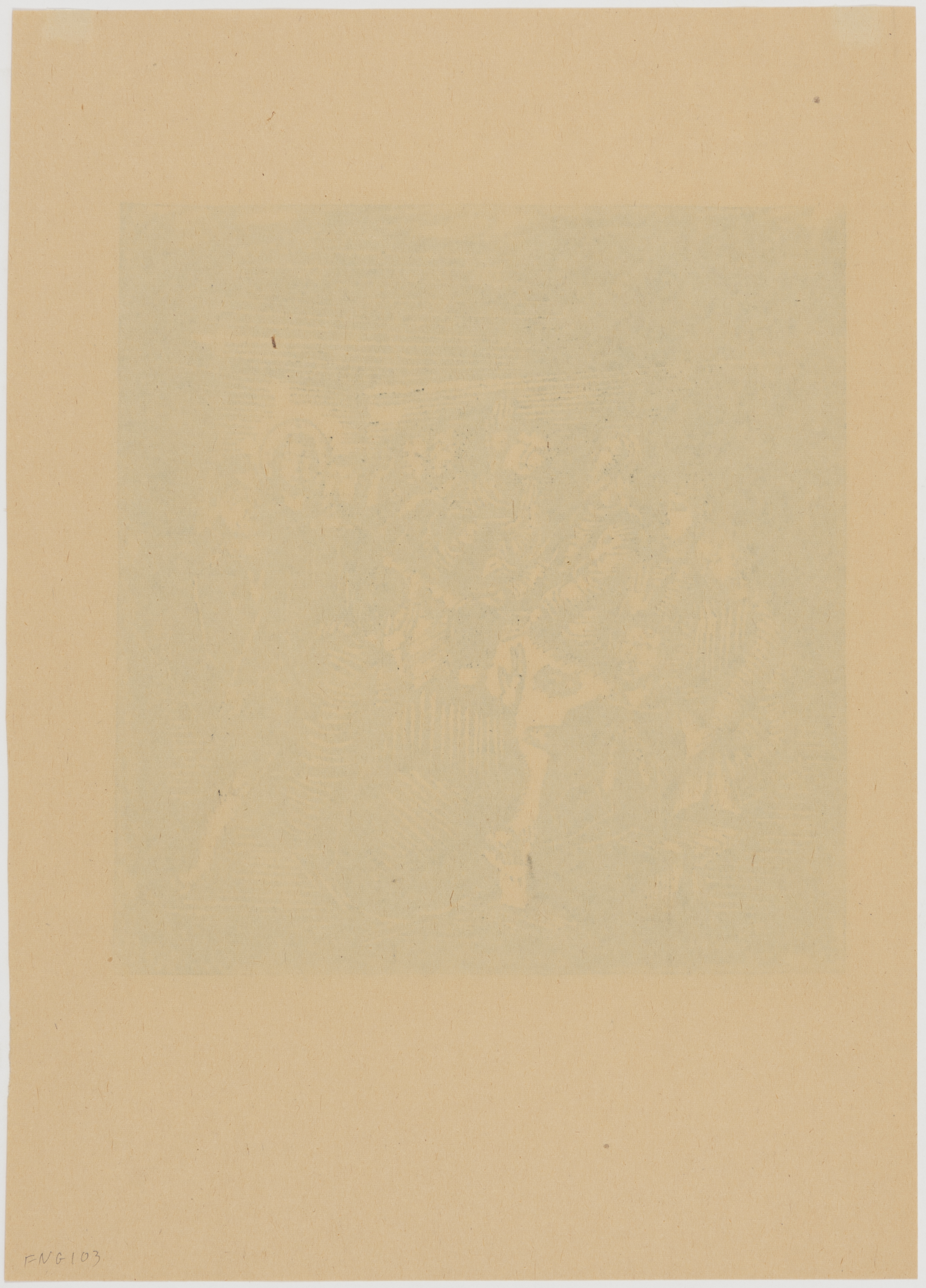 Recto: Christmas stamp hinges at upper left and upper right. The paper sheet is overall yellowish tan. Fred often drew and printed on any paper he had handy at the time. Many of his drawings can be found on the back of business letterhead for instance. He often printed on inferior quality papers just because that is what he had available. This print is a mystery as if it is not the paper's original color, it has turned this color so uniformly, it is not possible to know with the naked eye.