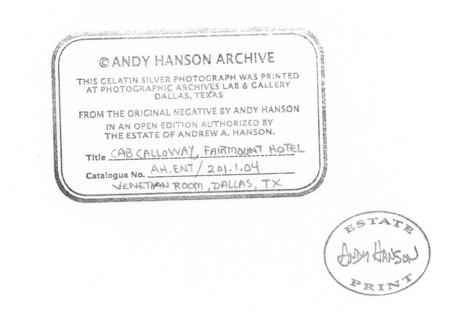 This modern print was produced for gallery inventory during Andy Hanson's lifetime, and with his approval of print quality. Upon his death, his estate allowed the remaining inventory of prints to be sold by Photographic Archives Gallery. The original negative is in the Andy Hanson Collection at DeGolyer Library, Southern Methodist University, Dallas, Texas and the Library holds the copyright.