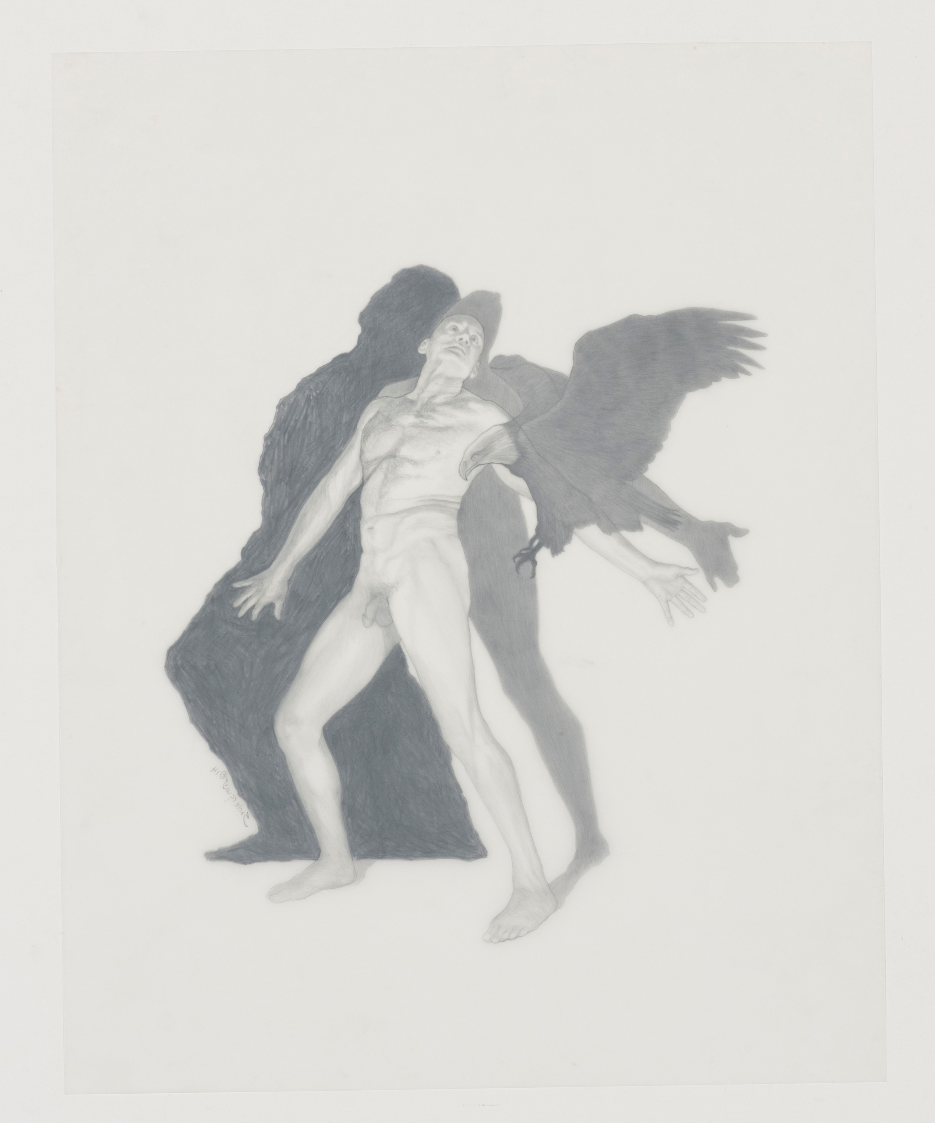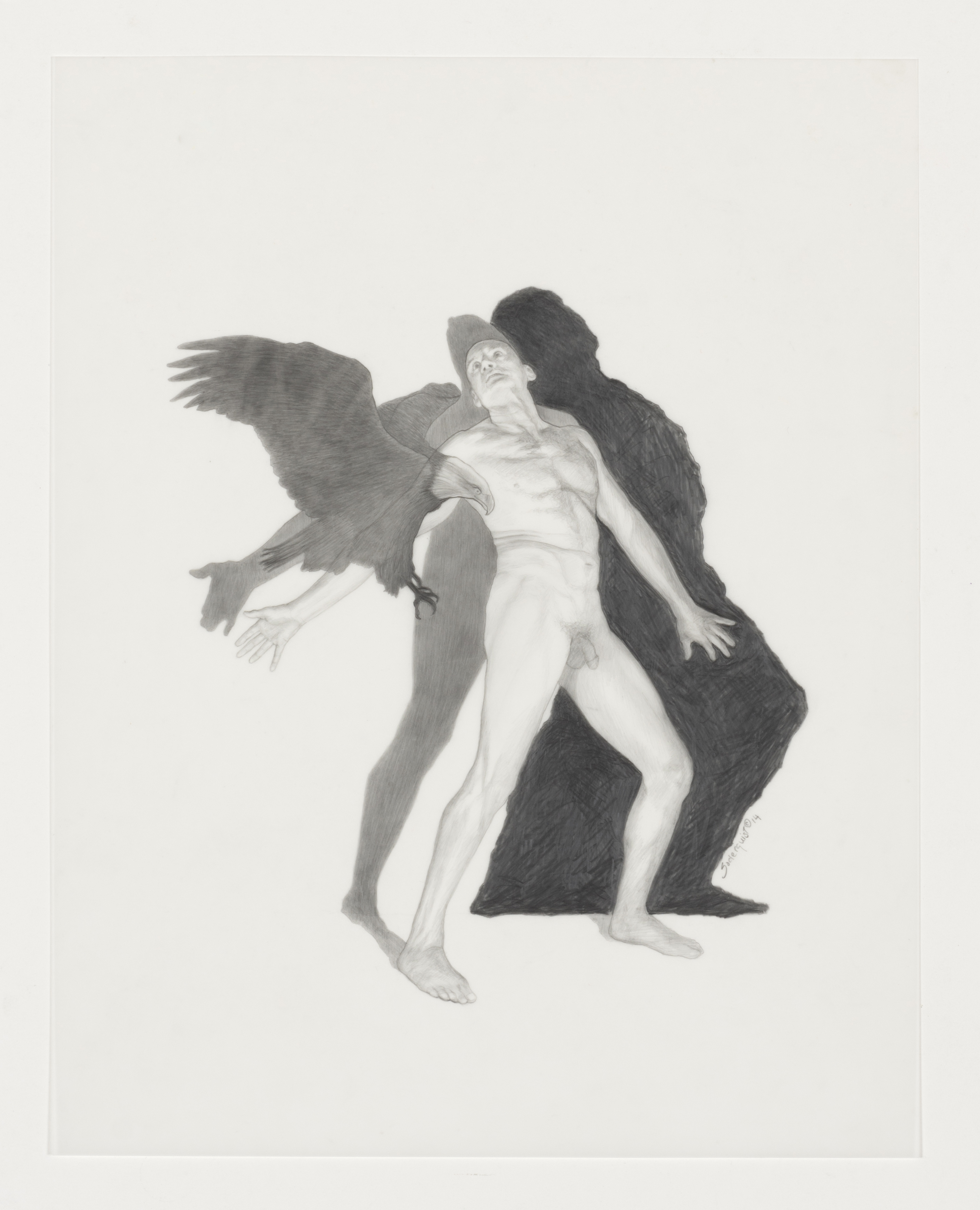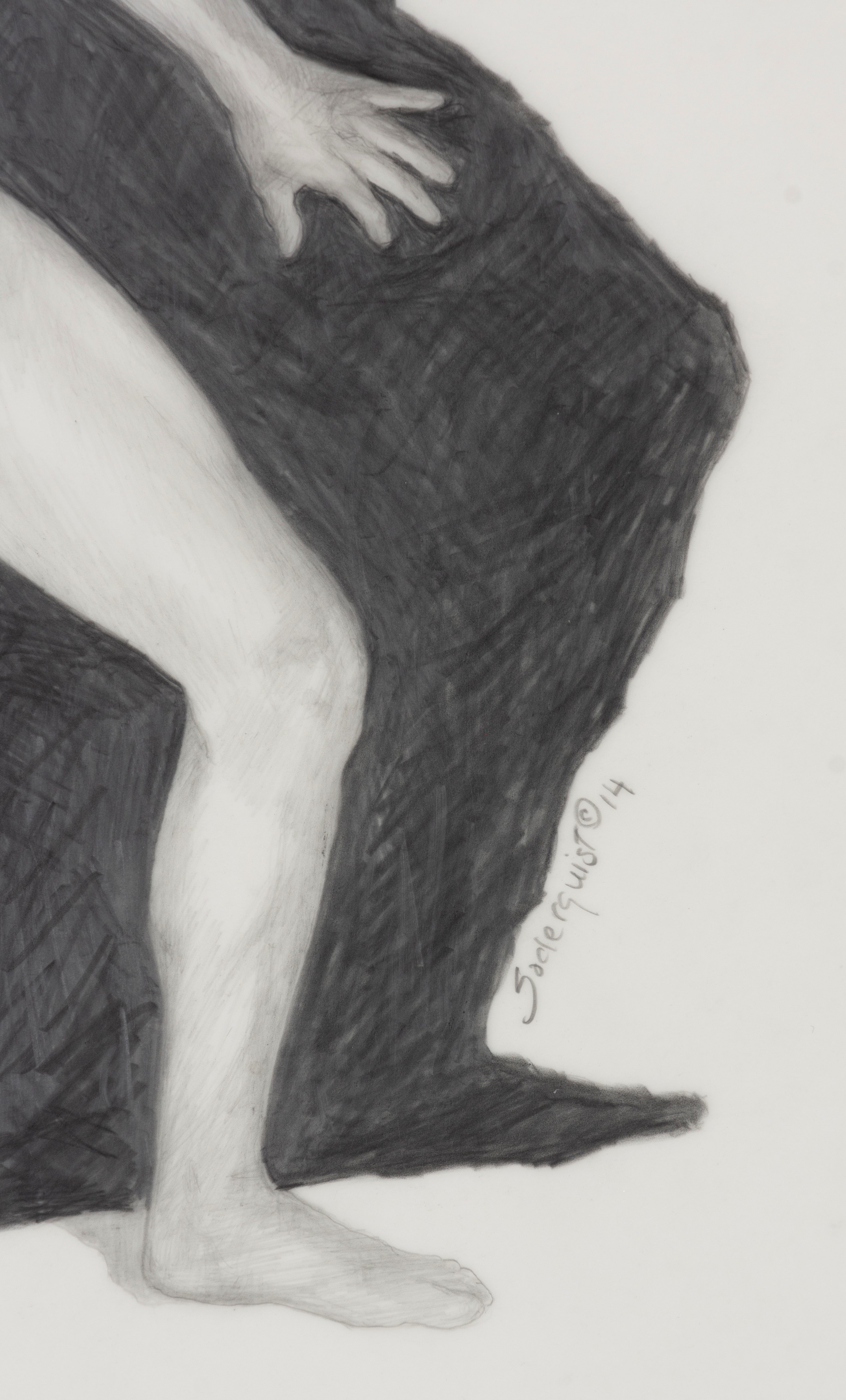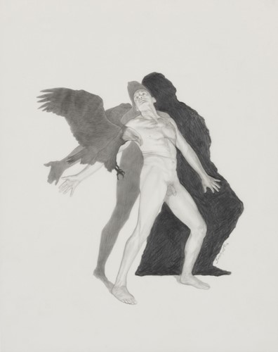 Soderquist’s “Shadow Myth” series was executed in 2014. She places nude figures juxtaposed to their dark narrative shadows. The shadows suggest the figure’s role as a character in Greek Mythology for which the drawing is named.