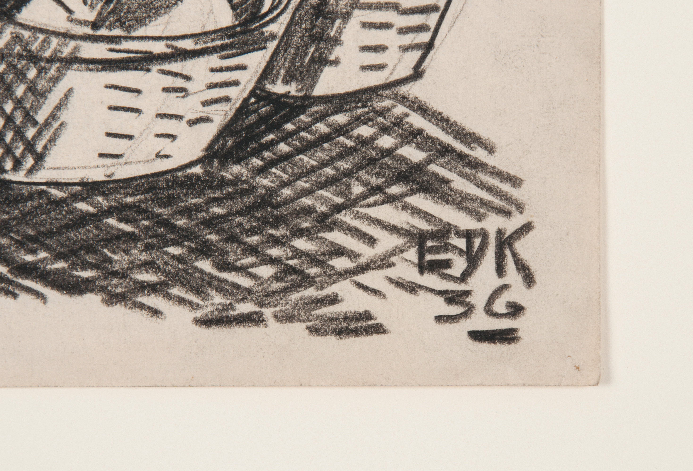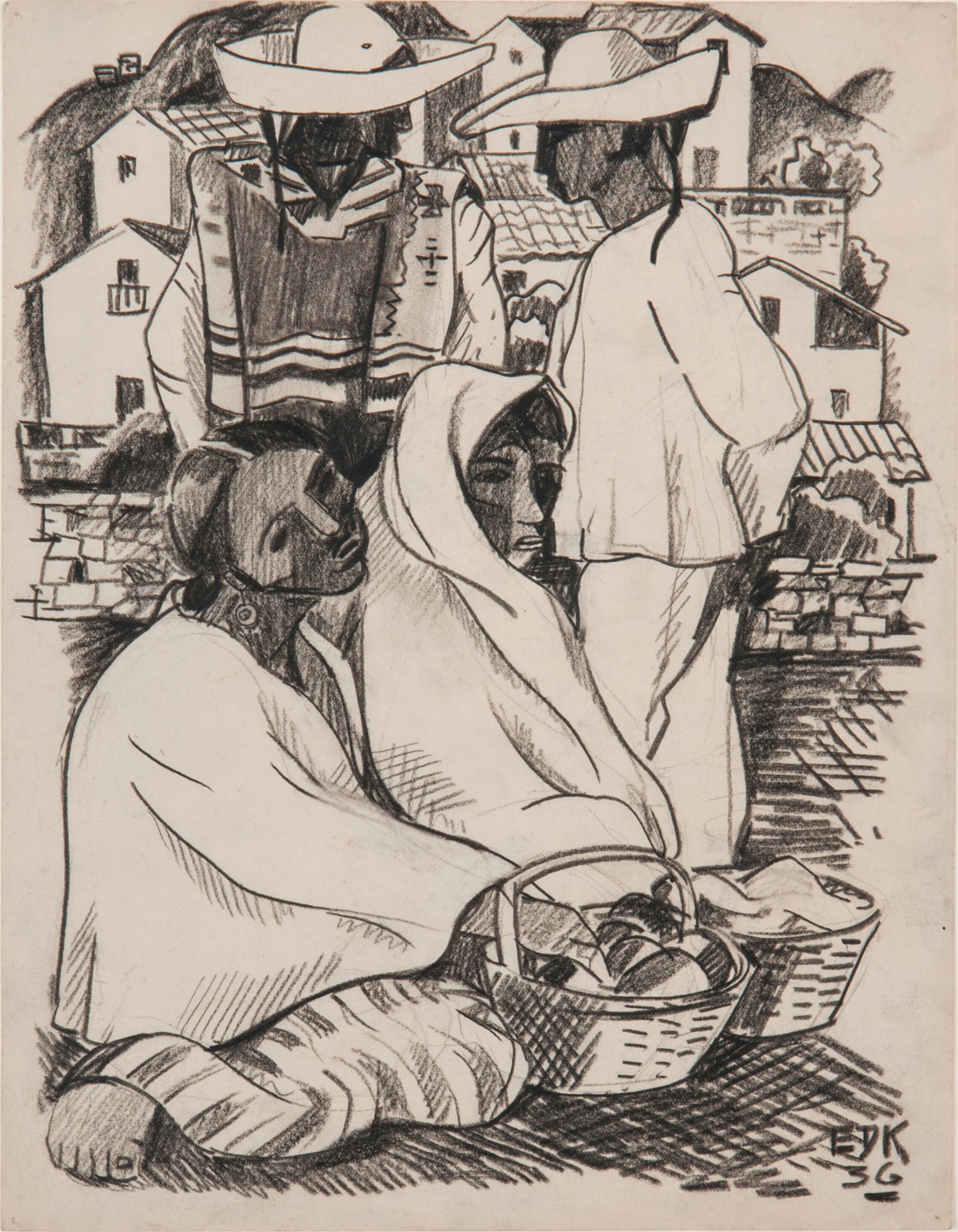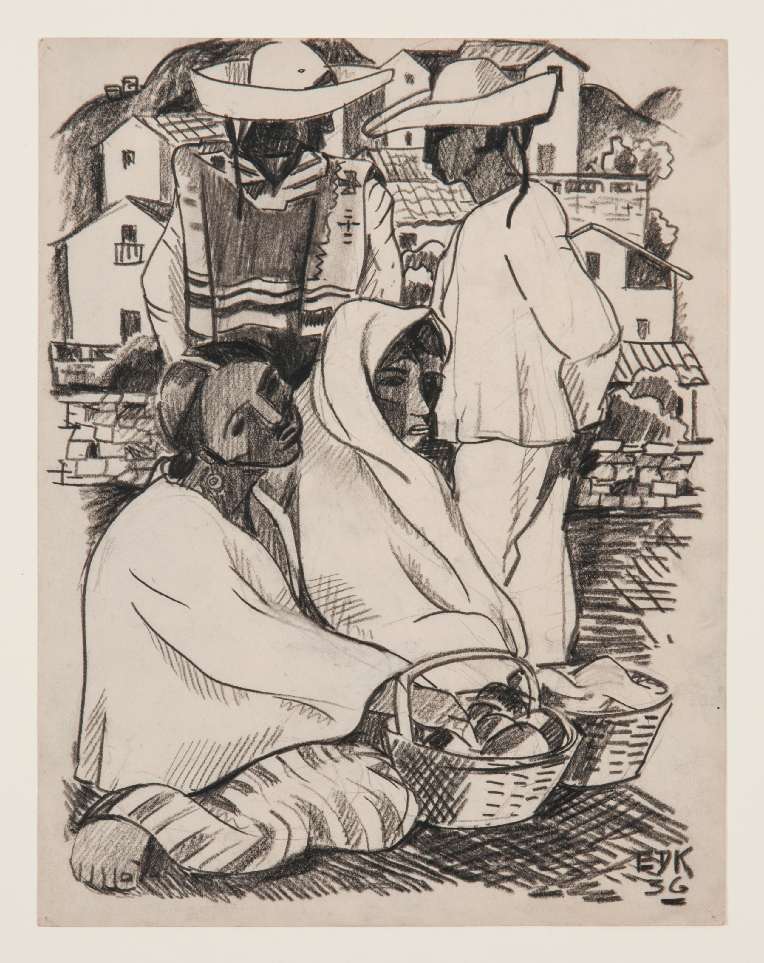 While the exact location of this drawing is unknown, Kinzinger taught a Landscape course in Taxco, Mexico in 1930. It was during this time that Kinzinger realized he needed to mix his Italian painting with Mexican motifs. In 1942, Kinzinger finished his PhD at the University of Iowa where his dissertation focused on his theories about Mexican motif painting. Kinzinger spent the summer of 1944 in Mexico, working on his Mexican motif paintings. From this timeline, we think it is likely that this drawing was created in Mexico.