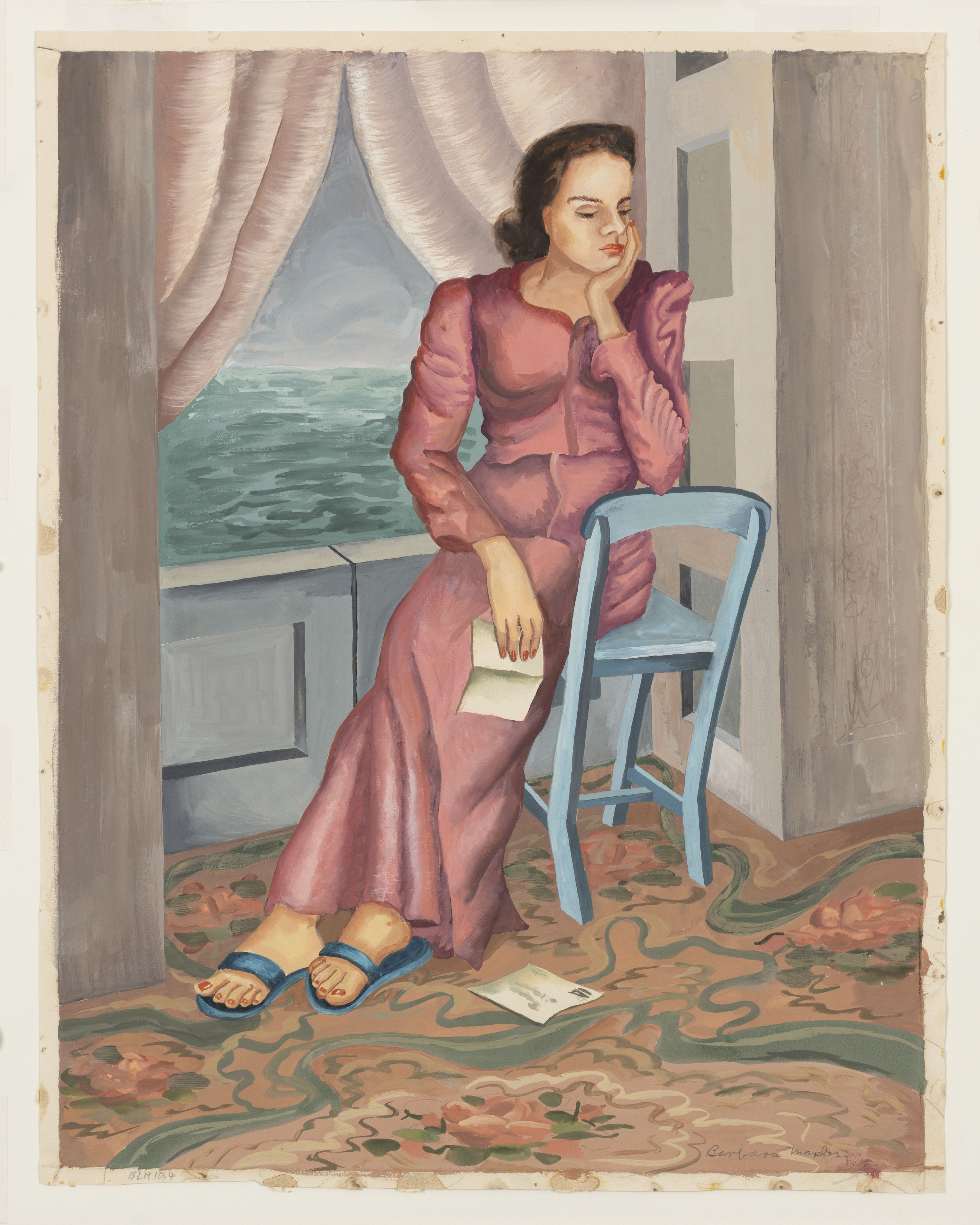 Many Texas Regionalist works have surreal aspects to them. The lady in the blue chair seems to have read a letter and is now in a dreamlike state. The drapes on the outside of the opening and the gate that seem so be holding back the water beyond seem to portent an impending flow of emotions.
