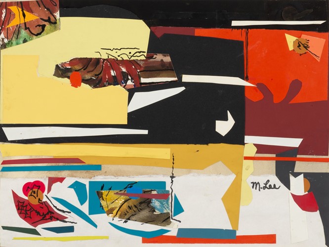 This artwork was created towards the end of the artist's career. She was showing this type of abstract collage in competitive exhibitions during this period. In this particular collage, some of the collage elements were cut from abandoned watercolors.