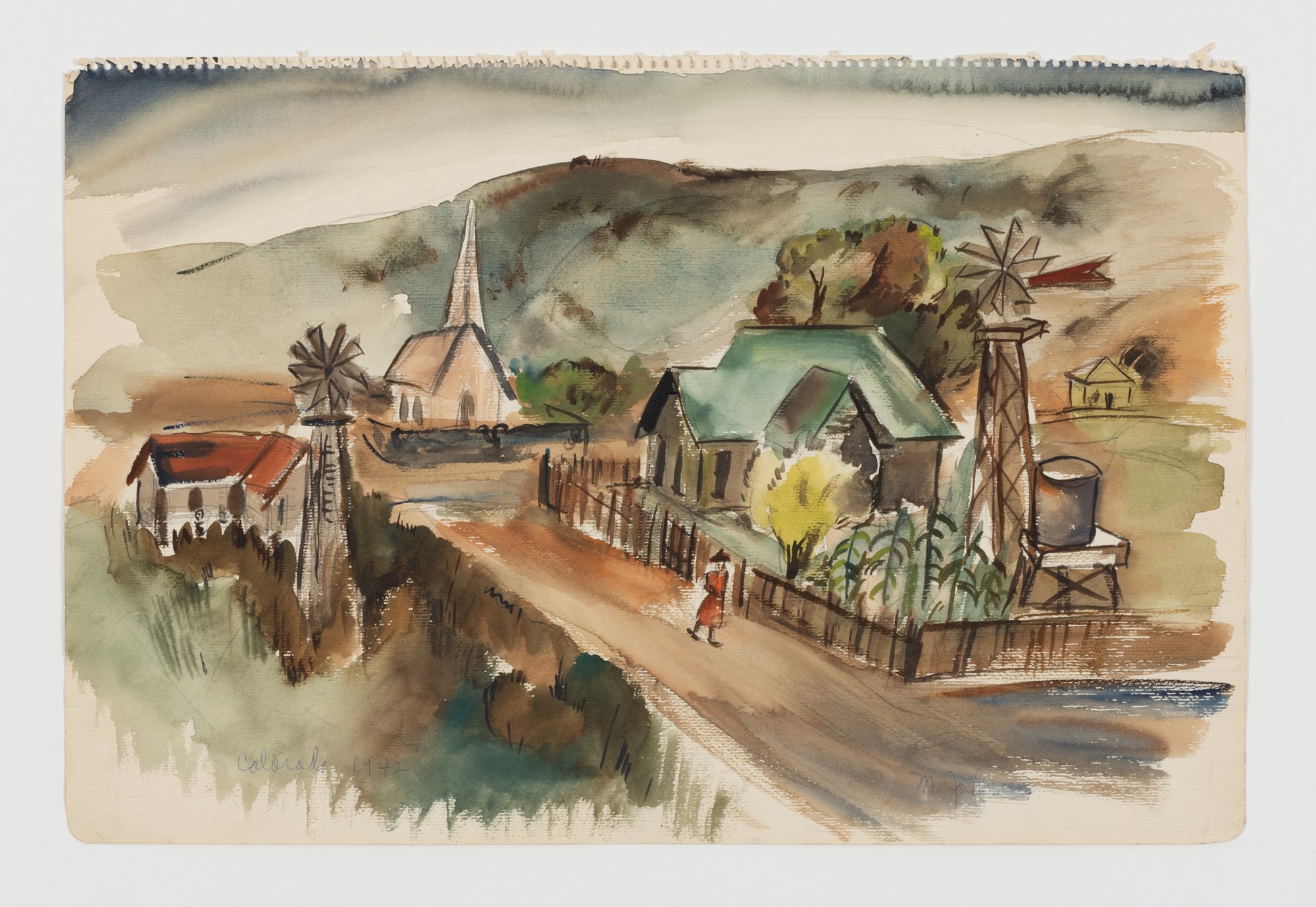 After taking classes at TCU for two years, she dropped out when Blanch McVeigh, a respected artist and printmaker who was a principal of the Fort Worth School of Fine Arts along with Evaline Sellors and Wade Jolly, was impressed enough with her artistic talent to invite her to enroll in their school. Under Jolly’s tutelage, she became a skilled landscape watercolorist.