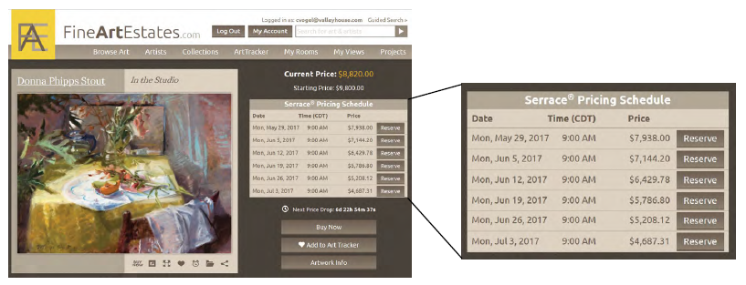 The Serrace Sales System places each artwork online at its full retail price, holds it there for a prescribed period of time to maximize the number of interested parties, and then, on a published schedule, systematically reduces its price until the artwork sells, or is about to drop below its lowest acceptable price. This way, each artwork placed on FAE receives maximum exposure at its highest price first,